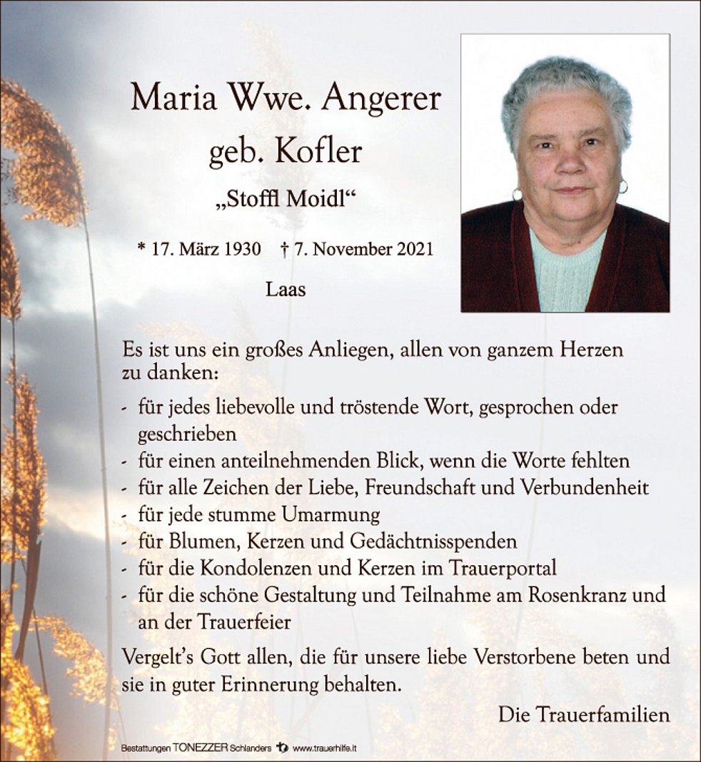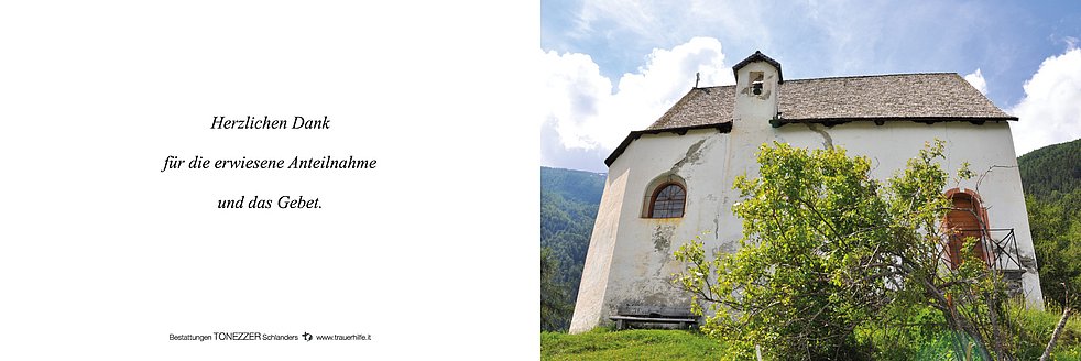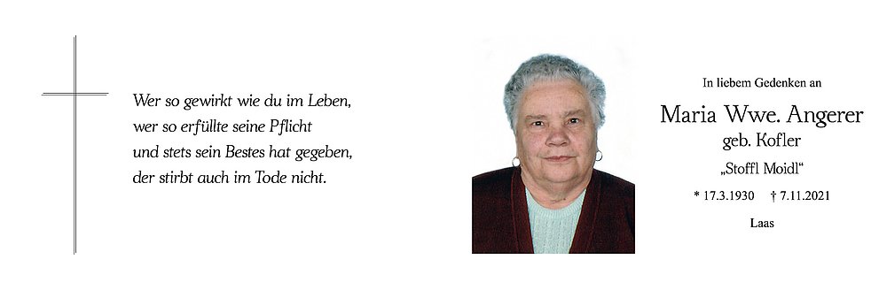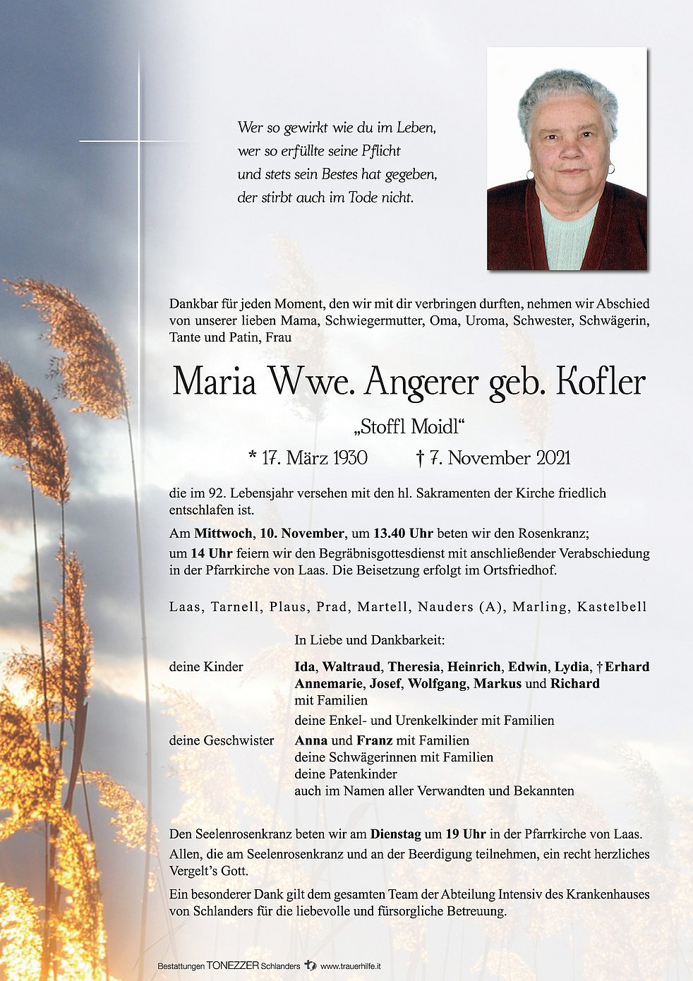 Am Mittwoch, 10. November, um 13.40 Uhr beten wir den Rosenkranz; um 14 Uhr feiern wir den Begräbnisgottesdienst mit anschließender Verabschiedung in der Pfarrkirche von Laas.