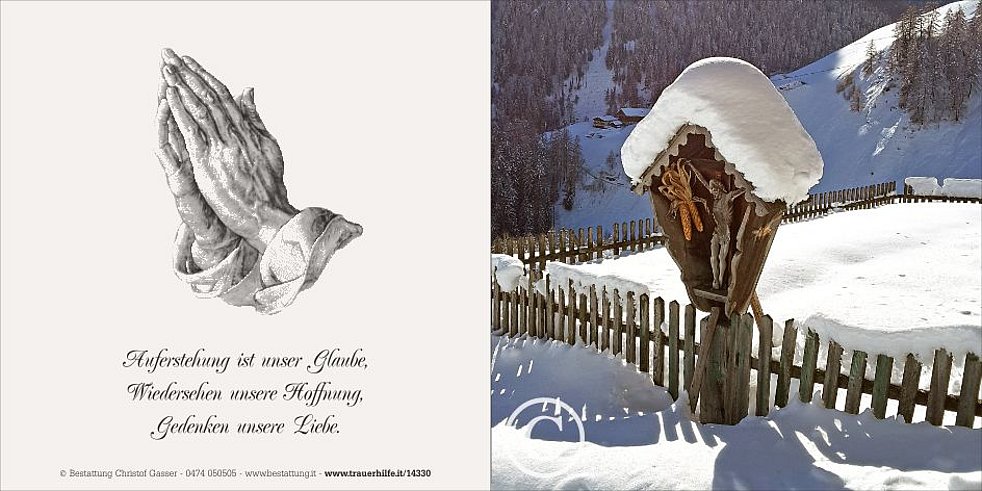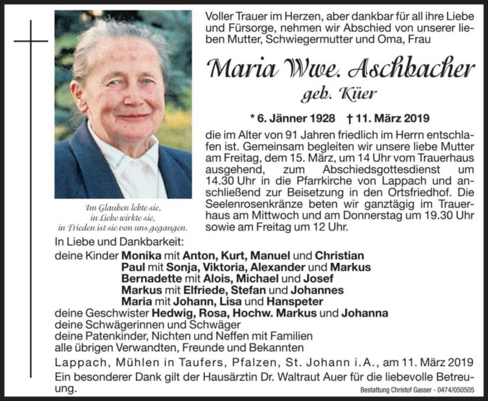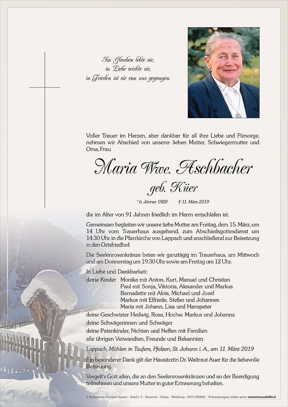 Gemeinsam begleiten wir unsere liebe Mutter am Freitag, dem 15. März, um 14 Uhr vom Trauerhaus ausgehend, zum Abschiedsgottesdienst um 14.30 Uhr in die Pfarrkirche von Lappach und anschließend zur Beisetzung in den Ortsfriedhof.
