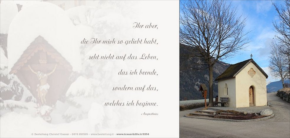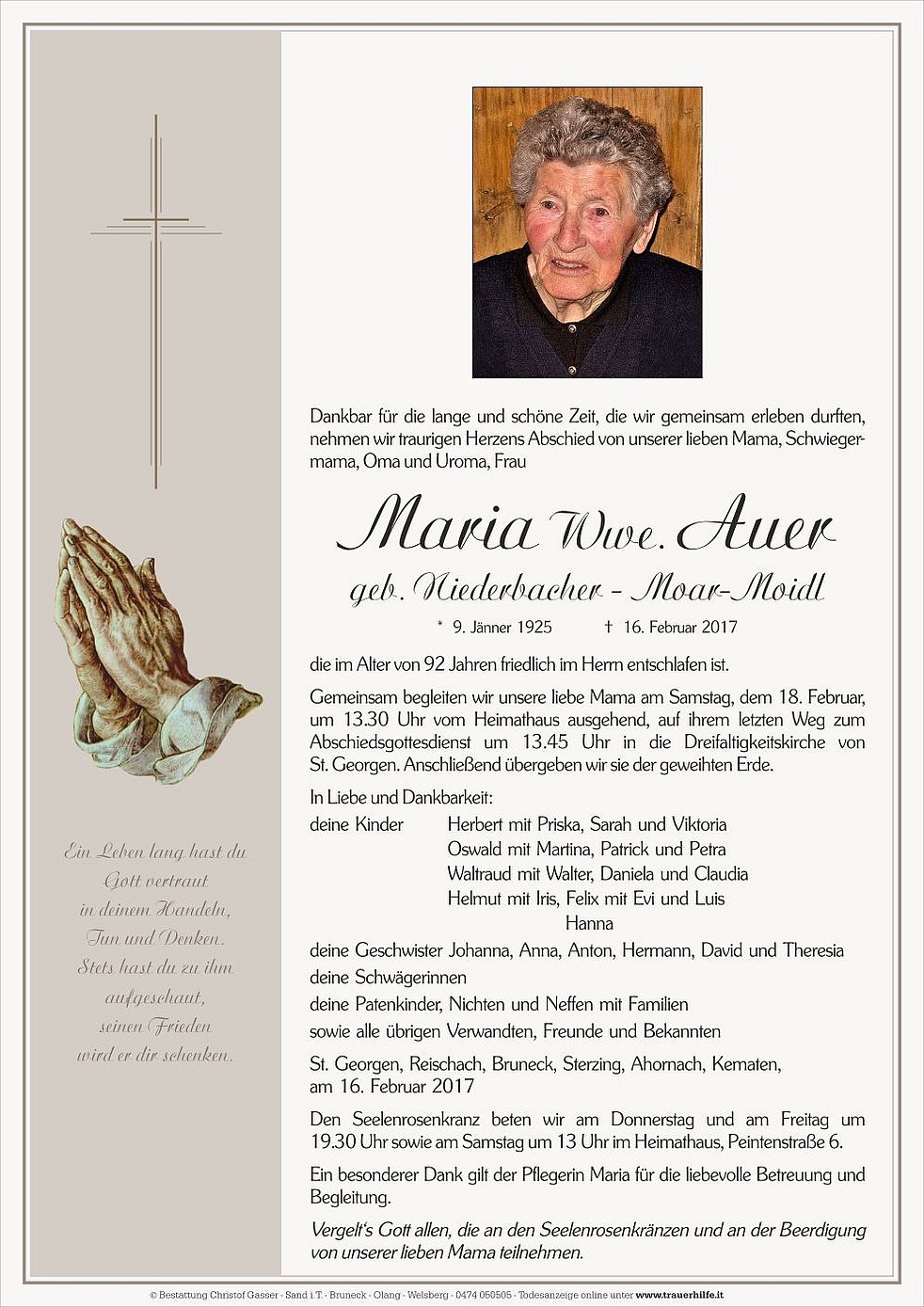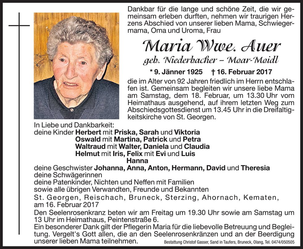 Gemeinsam begleiten wir unsere liebe Mama am Samstag, dem 18. Februar, um 13.30 Uhr vom Heimathaus ausgehend, auf ihrem letzten Weg zum Abschiedsgottesdienst um 13.45 Uhr in die Dreifaltigkeitskirche von St. Georgen. Anschließend übergeben wir sie der geweihten Erde.