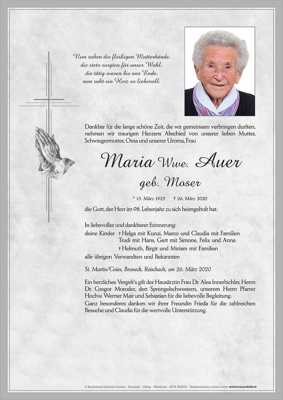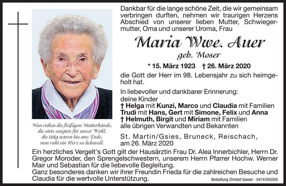 Ein herzliches Vergelt‘s gilt der Hausärztin Frau Dr. Alea Innerbichler, Herrn Dr. Gregor Moroder, den Sprengelschwestern, unserem Herrn Pfarrer Hochw. Werner Mair und Sebastian für die liebevolle Begleitung.