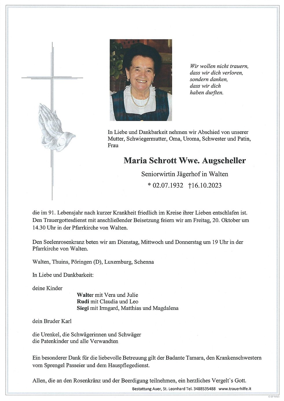Den Trauergottesdienst mit anschließender Beisetzung feiern wir am Freitag, 20. Oktober um 14.30 Uhr in der Pfarrkirche von Walten.