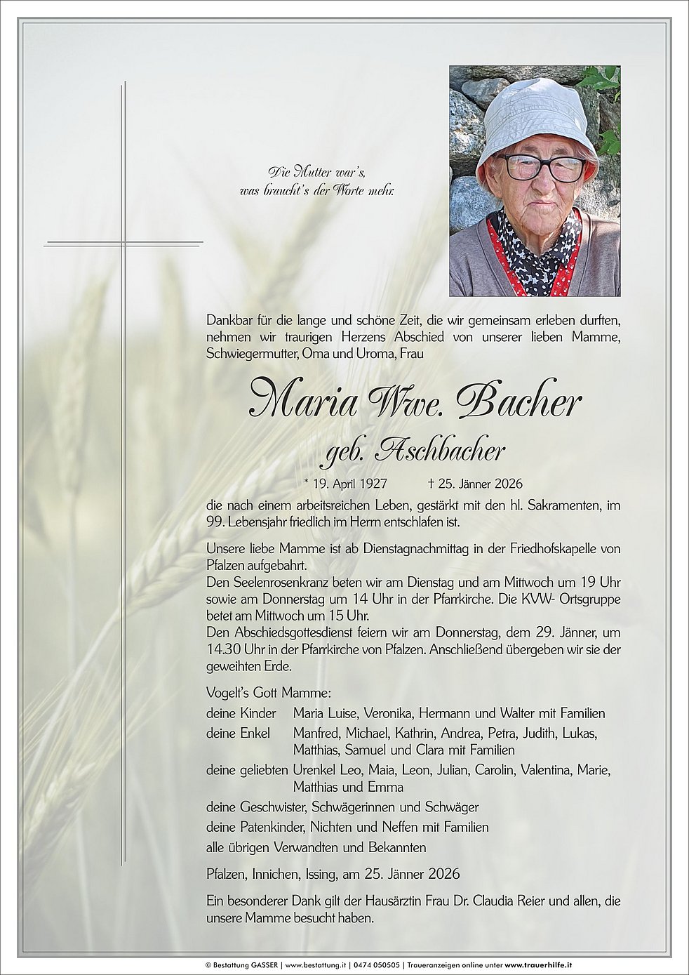 die nach einem arbeitsreichen Leben, gestärkt mit den hl. Sakramenten, im 99. Lebensjahr friedlich im Herrn entschlafen ist.