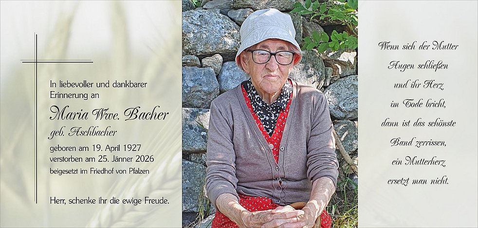 Den Abschiedsgottesdienst feiern wir am Donnerstag, dem 29. Jänner, um 14.30 Uhr in der Pfarrkirche von Pfalzen. Anschließend übergeben wir sie der geweihten Erde.