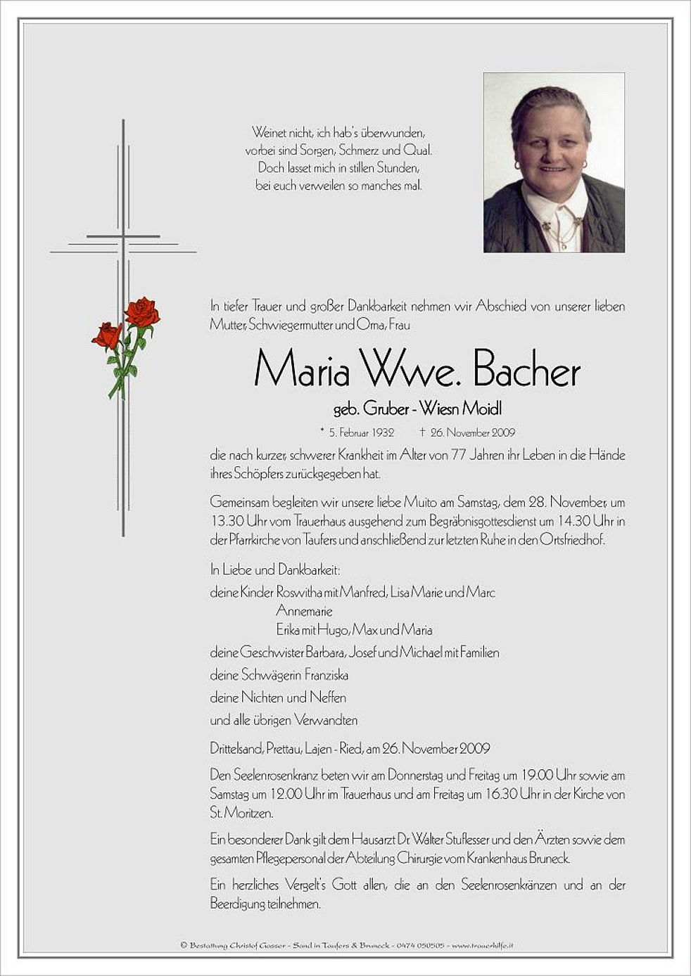 Gemeinsam begleiten wir unsere liebe Muito am Samstag, dem 28. November, um 13.30 Uhr vom Trauerhaus ausgehend zum Begräbnisgottesdienst um 14.30 Uhr in der Pfarrkirche von Taufers und anschließend zur letzten Ruhe in den Ortsfriedhof.
