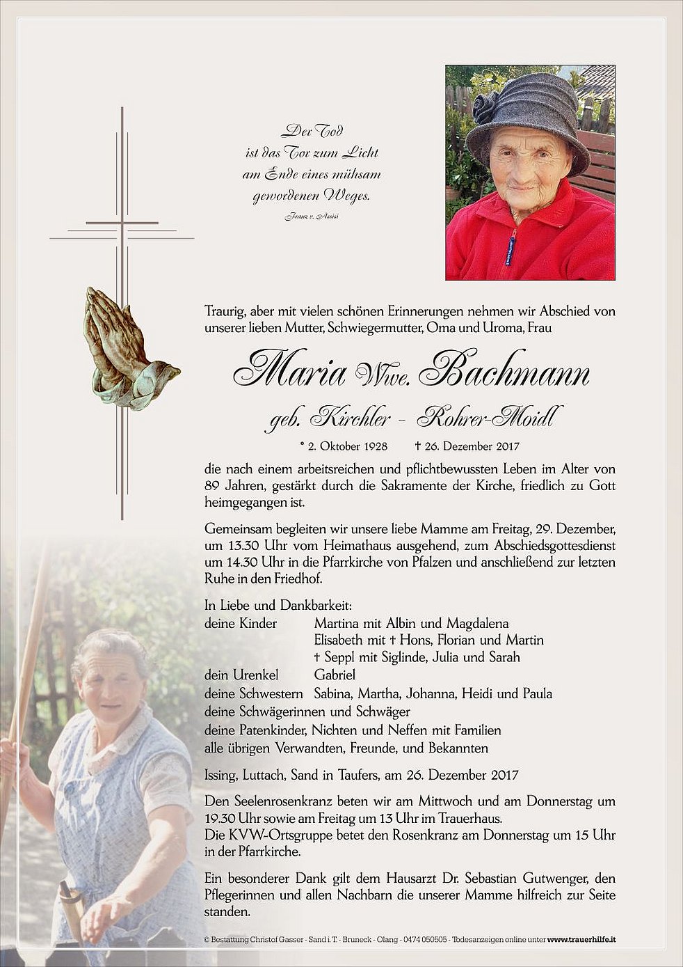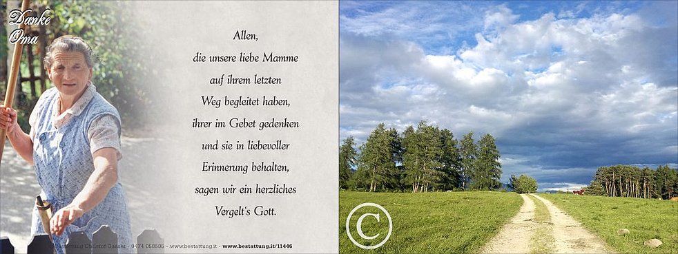 Ein besonderer Dank gilt dem Hausarzt Dr. Sebastian Gutwenger, den Pflegerinnen und allen Nachbarn die unserer Mamme hilfreich zur Seite standen.