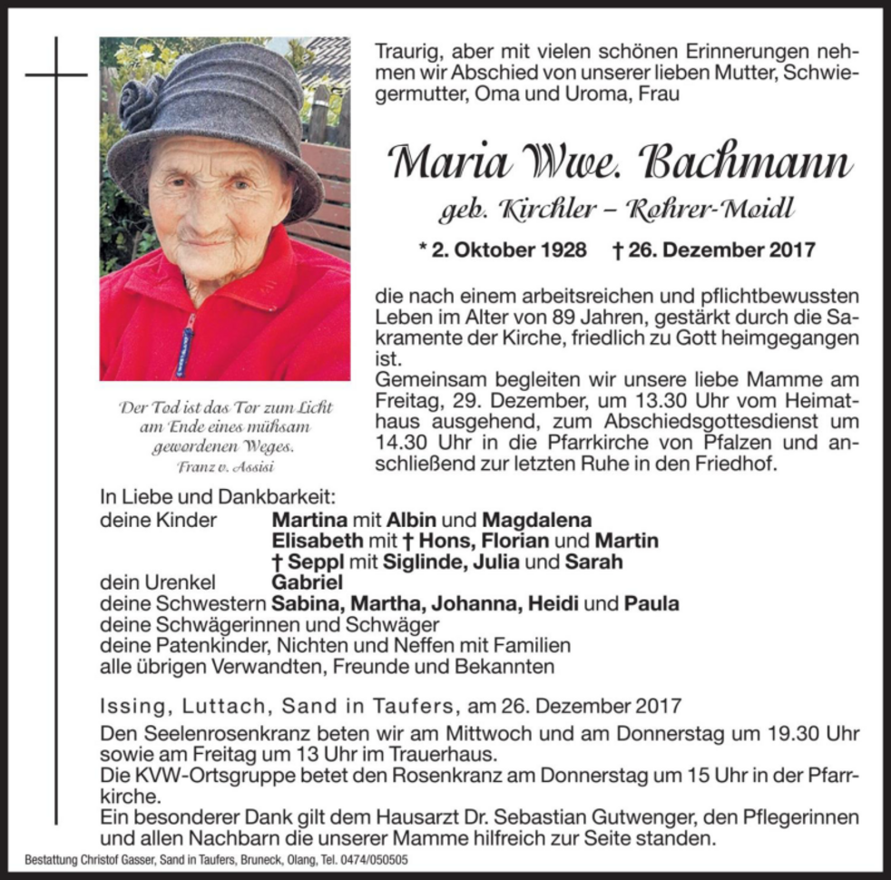 Gemeinsam begleiten wir unsere liebe Mamme am Freitag, 29. Dezember, um 13.30 Uhr vom Heimathaus ausgehend, zum Abschiedsgottesdienst um 14.30 Uhr in die Pfarrkirche von Pfalzen und anschließend zur letzten Ruhe in den Friedhof.