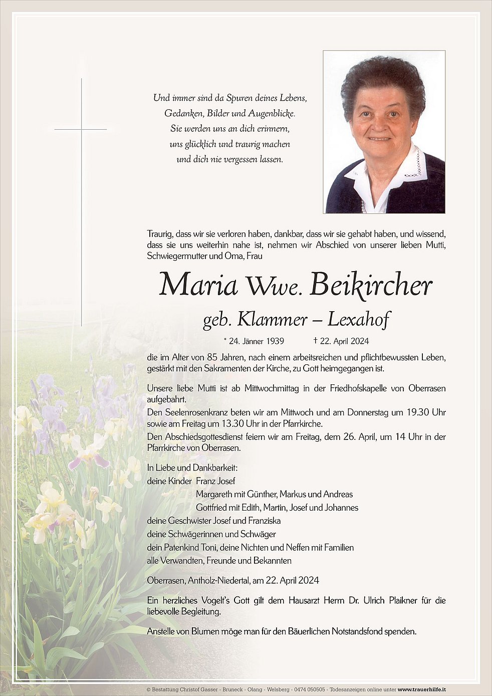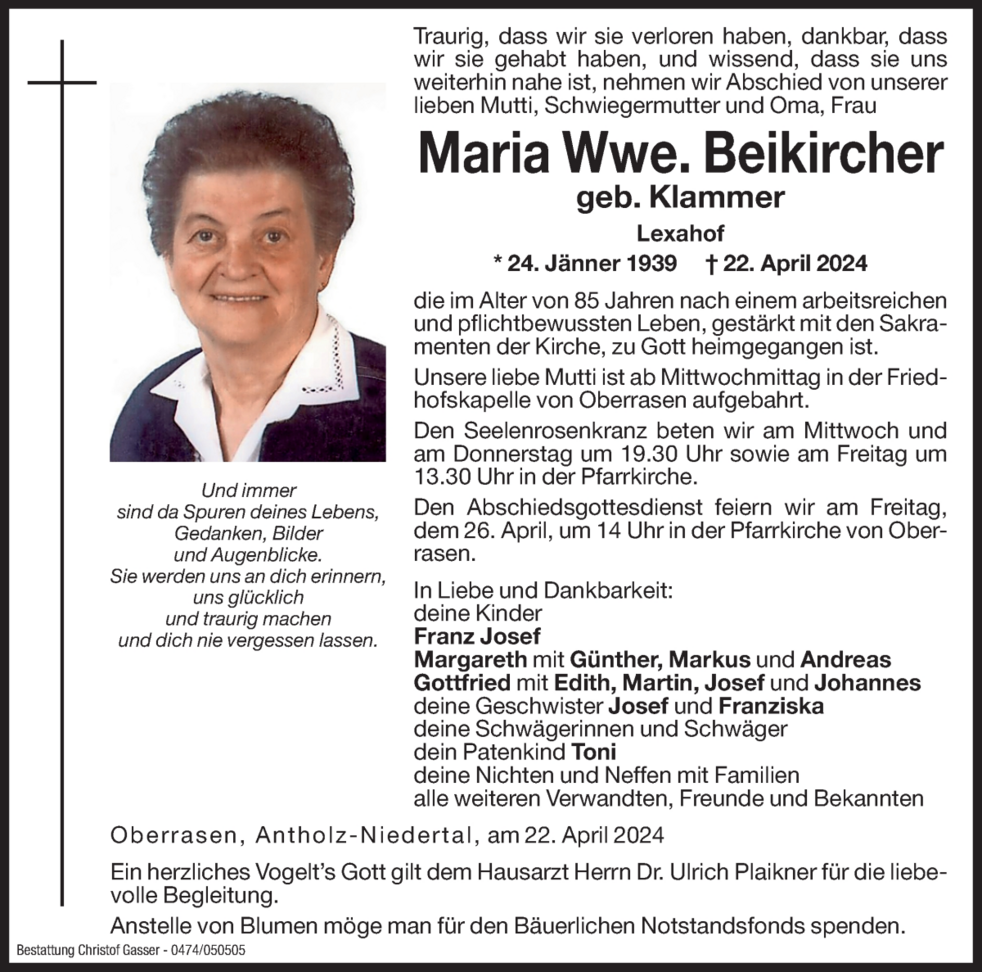die im Alter von 85 Jahren, nach einem arbeitsreichen und pflichtbewussten Leben, gestärkt mit den Sakramenten der Kirche, zu Gott heimgegangen ist.