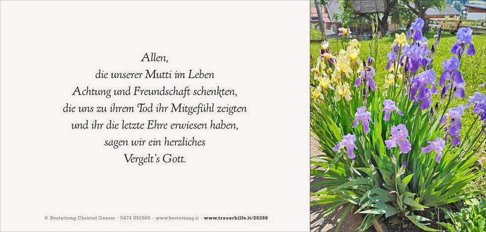 Unsere liebe Mutti ist ab Mittwochmittag in der Friedhofskapelle von Oberrasen aufgebahrt.