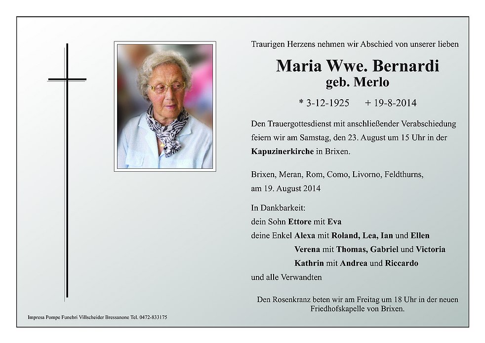 Den Trauergottesdienst mit anschließender Verabschiedung feiern wir am Samstag, den 23. August um 15 Uhr in der Kapuzinerkirche in Brixen.