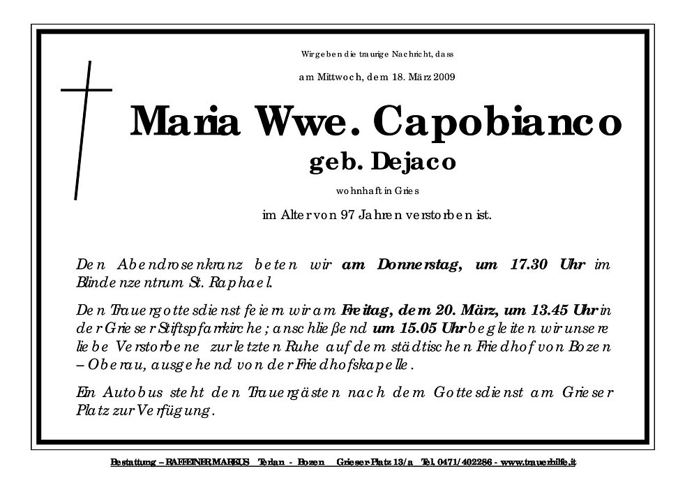 Den Trauergottesdienst feiern wir am Freitag, dem 20. März, um 13.45 Uhr in der Grieser Stiftspfarrkirche; anschließend um 15.05 Uhr begleiten wir unsere liebe Verstorbene zur letzten Ruhe auf den städtischen Friedhof von Bozen – Oberau, ausgehend von der Friedhofskapelle.