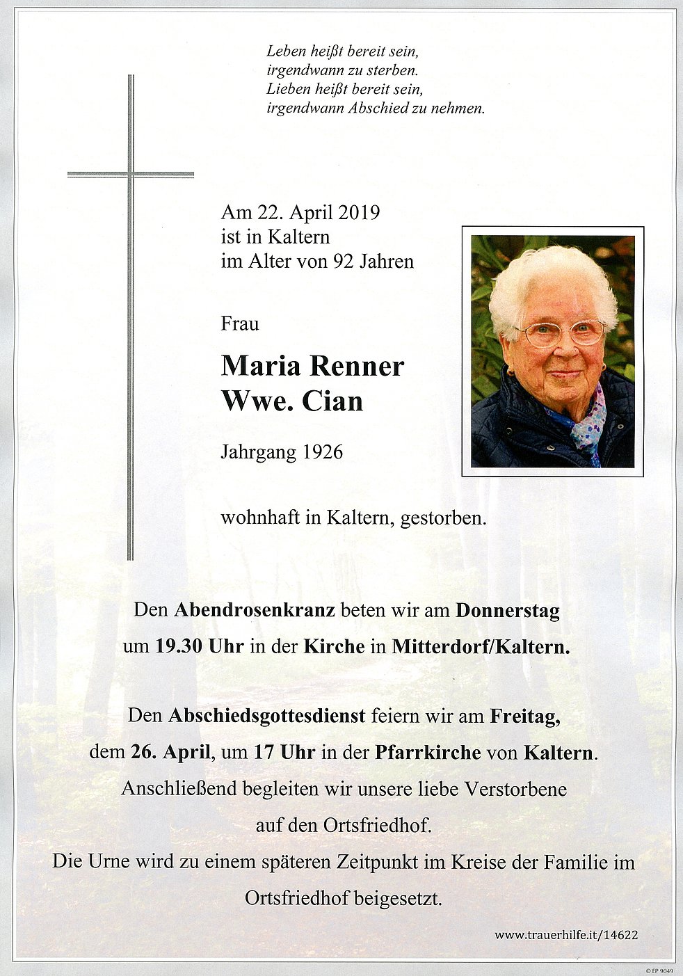 Den Abschiedsgottesdienst feiern wir am Freitag, dem 26. April um 17 Uhr in der Pfarrkirche von Kaltern. Anschließend begleiten wir unsere liebe Verstorbene auf den Ortsfriedhof.