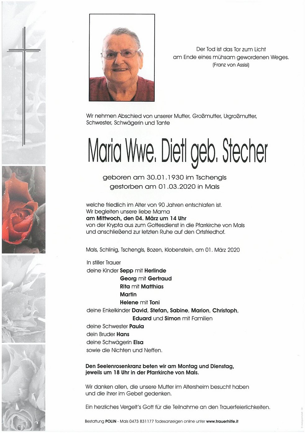 welche friedlich im Alter von 90 Jahren entschlafen ist.