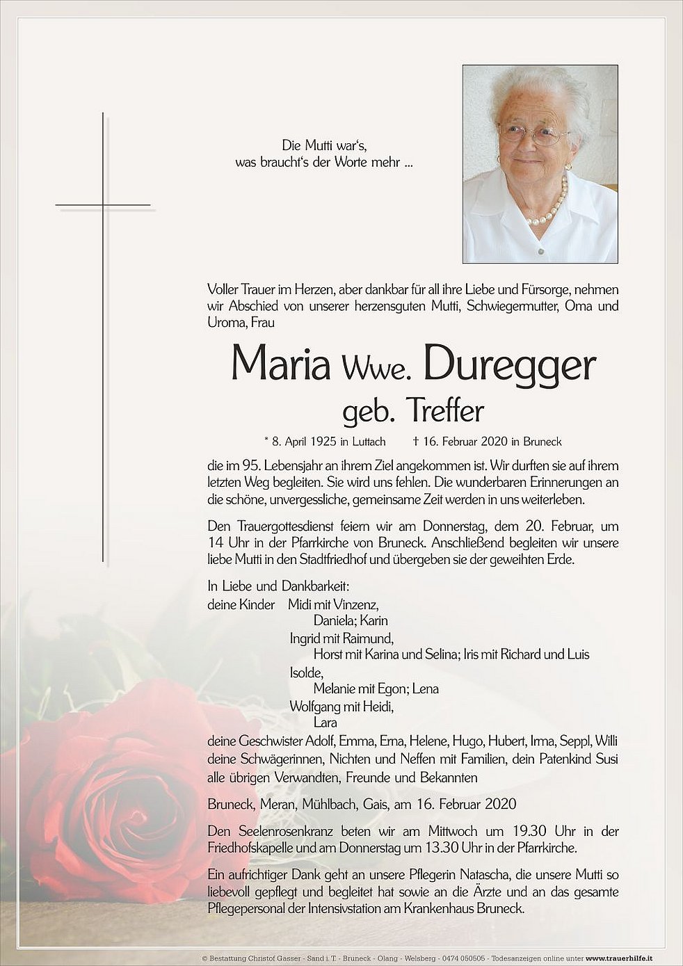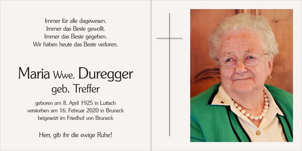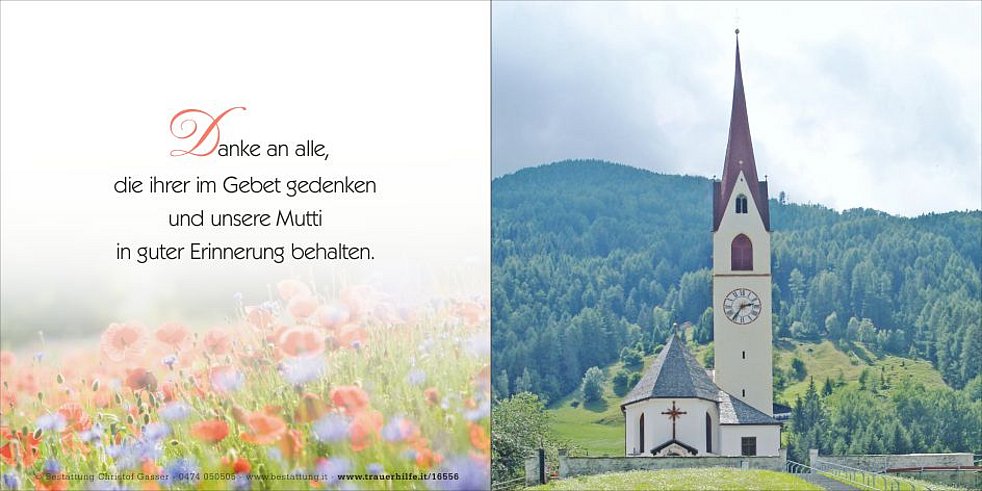Den Trauergottesdienst feiern wir am Donnerstag, dem 20. Februar, um 14 Uhr in der Pfarrkirche von Bruneck. Anschließend begleiten wir unsere liebe Mutti in den Stadtfriedhof und übergeben sie der geweihten Erde.