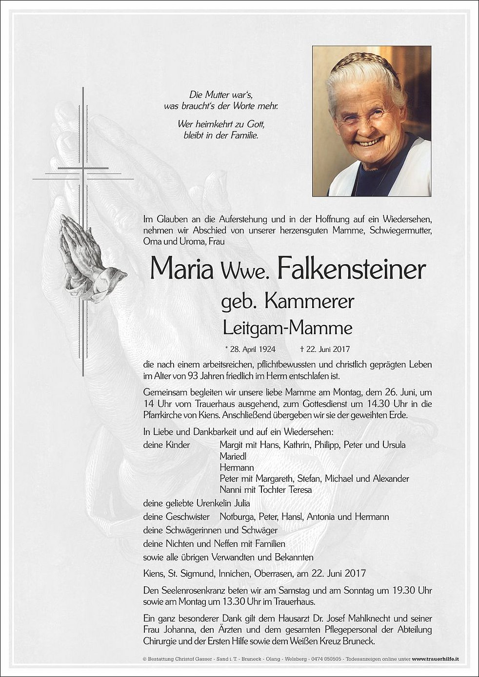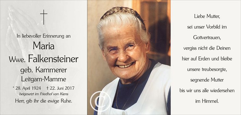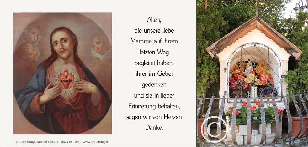 Gemeinsam begleiten wir unsere liebe Mamme am Montag, dem 26. Juni, um 14 Uhr vom Trauerhaus ausgehend, zum Gottesdienst um 14.30 Uhr in die Pfarrkirche von Kiens. Anschließend übergeben wir sie der geweihten Erde.