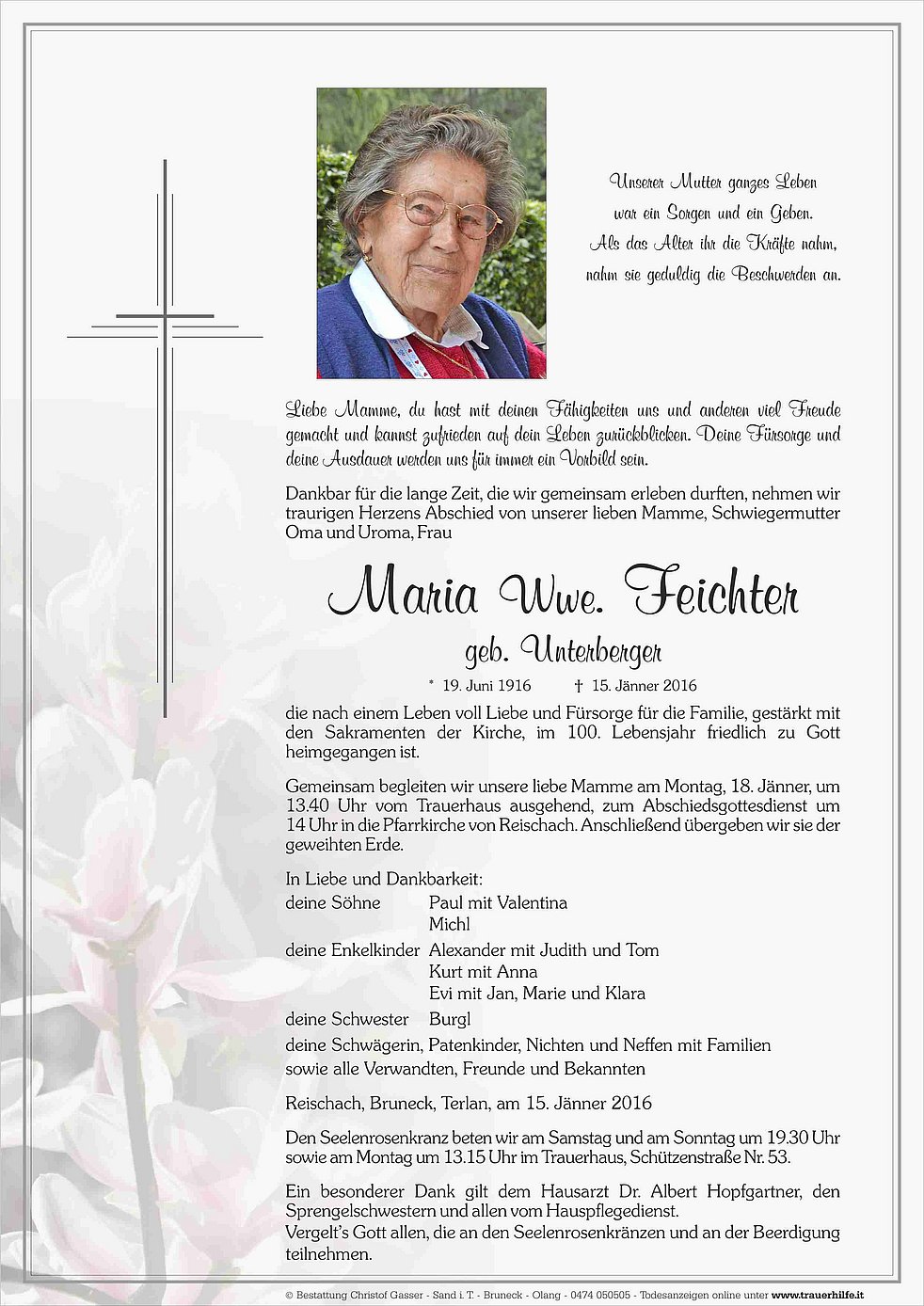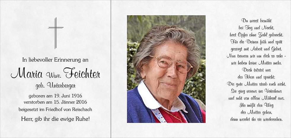 Gemeinsam begleiten wir unsere liebe Mamme am Montag, 18. Jänner, um 13.40 Uhr vom Trauerhaus ausgehend, zum Abschiedsgottesdienst um 14 Uhr in die Pfarrkirche von Reischach. Anschließend übergeben wir sie der geweihten Erde.