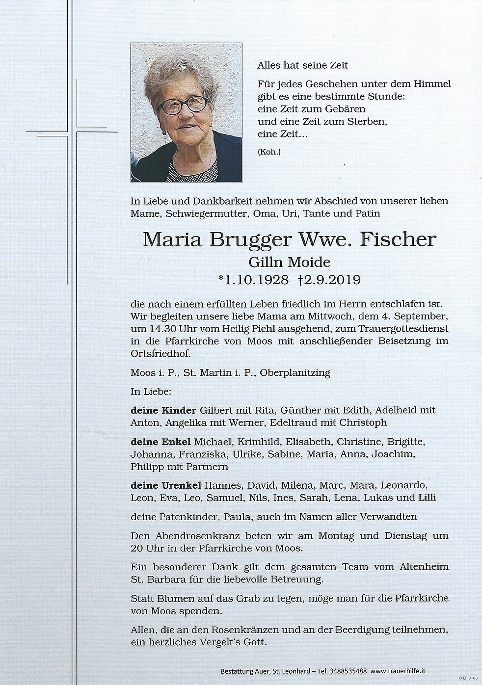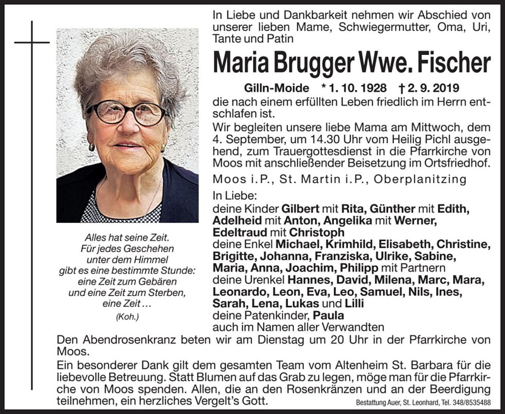 Wir begleiten unsere liebe Mama am Mittwoch, dem 4. September, um 14.30 Uhr vom Heilig Pichl ausgehend, zum Trauergottesdienst in die Pfarrkirche von Moos mit anschließender Beisetzung im Ortsfriedhof.