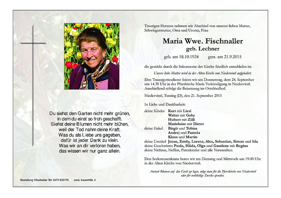 um 14.30 Uhr in der Pfarrkirche Maria Verkündigung in Niedervintl. Anschießend erfolgt die Beisetzung im Ortsfriedhof.