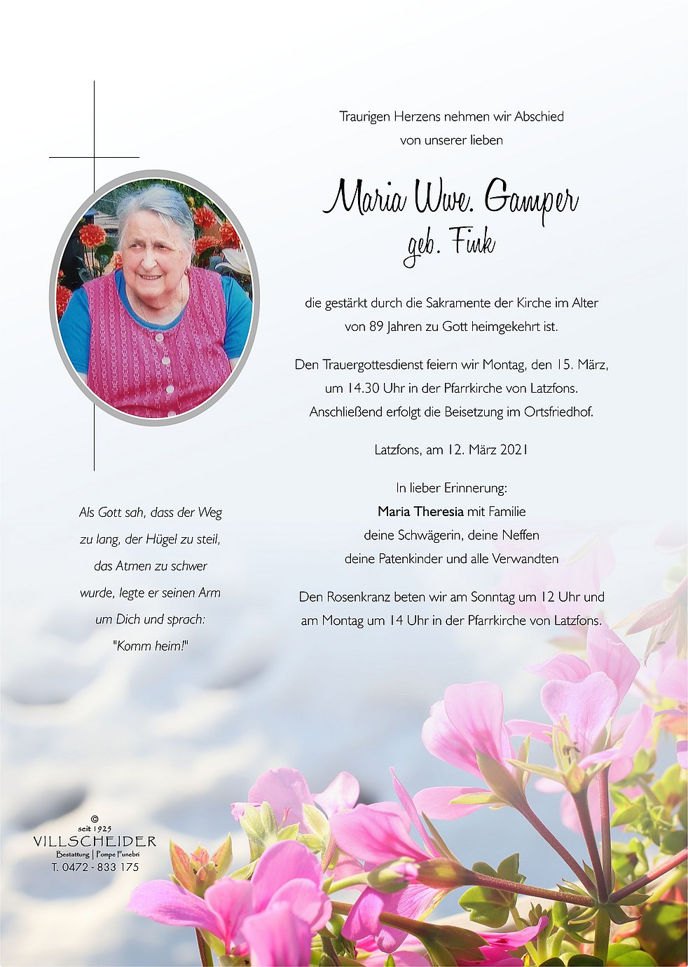 Begräbnisgottesdienst: 15.03. - 14:30 Uhr Latzfons