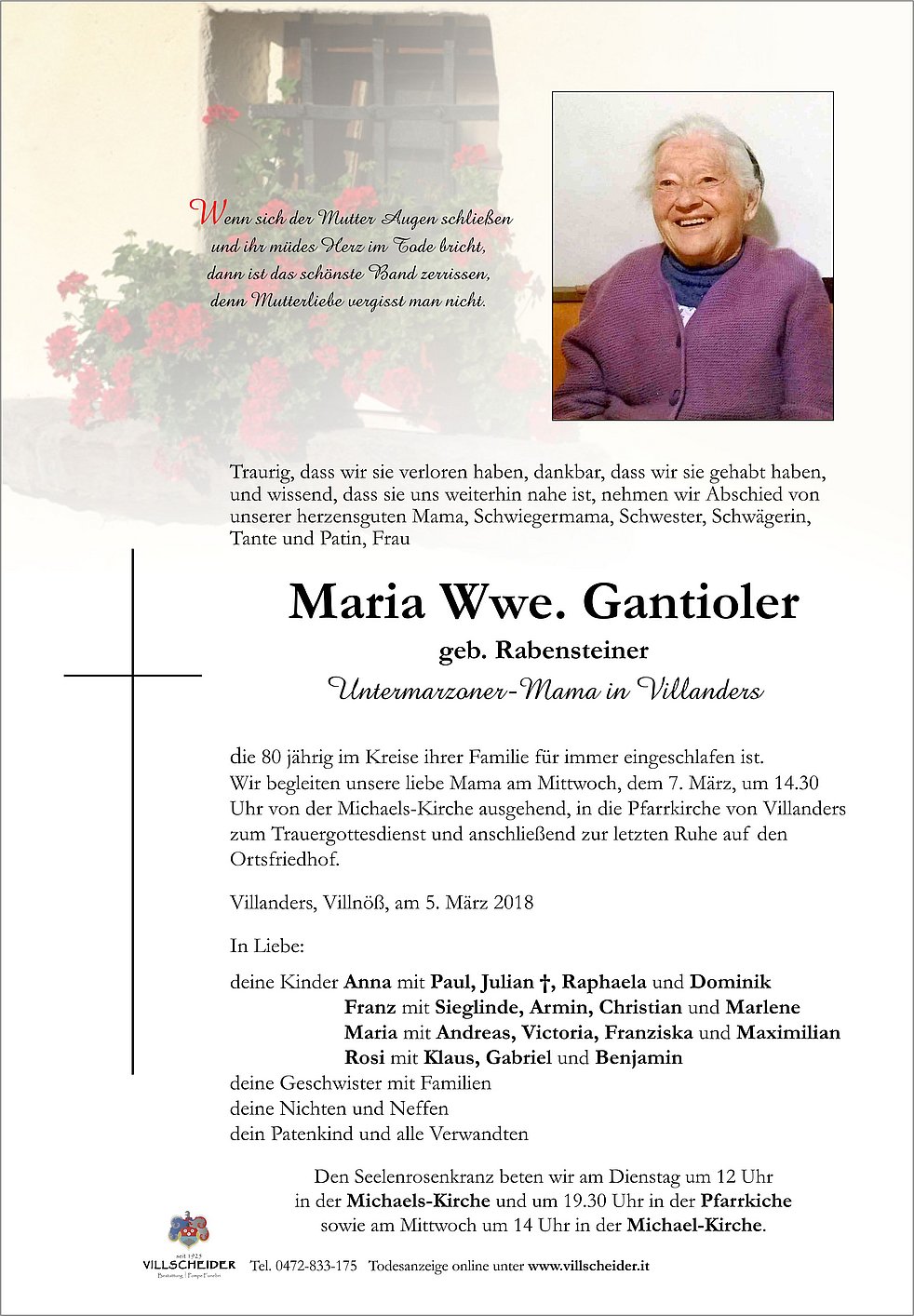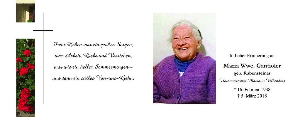 Wir begleiten unsere liebe Mama am Mittwoch, dem 7. März, um 14.30 Uhr von der Michaels-Kirche ausgehend, in die Pfarrkirche von Villanders zum Trauergottesdienst und anschließend zur letzten Ruhe auf den Ortsfriedhof.