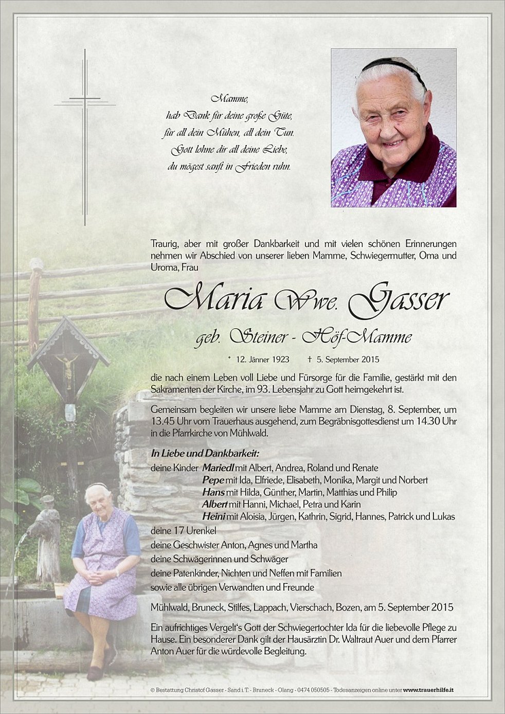 Gemeinsam begleiten wir unsere liebe Mamme am Dienstag, 8. September, um 13.45 Uhr vom Trauerhaus ausgehend, zum Begräbnisgottesdienst um 14.30 Uhr in die Pfarrkirche von Mühlwald.