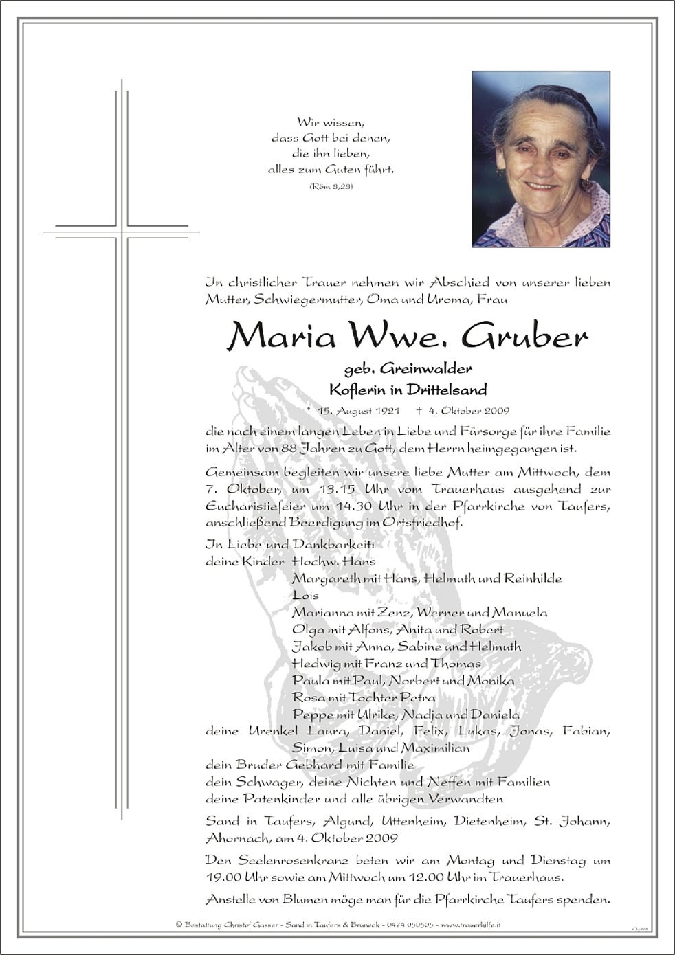 7. Oktober, um 13.15 Uhr vom Trauerhaus ausgehend zur Eucharistiefeier um 14.30 Uhr in der Pfarrkirche von Taufers, anschließend Beerdigung im Ortsfriedhof.