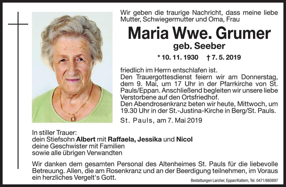 Den Trauergottesdienst feiern wir am Donnerstag, dem 9. Mai um 17 Uhr in der Pfarrkirche von St. Pauls/Eppan. Anschließend begleiten wir unsere liebe Verstorbene auf den Ortsfriedhof.