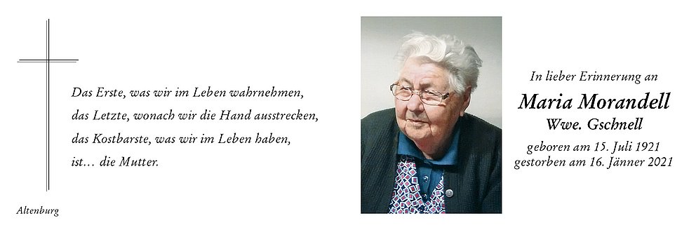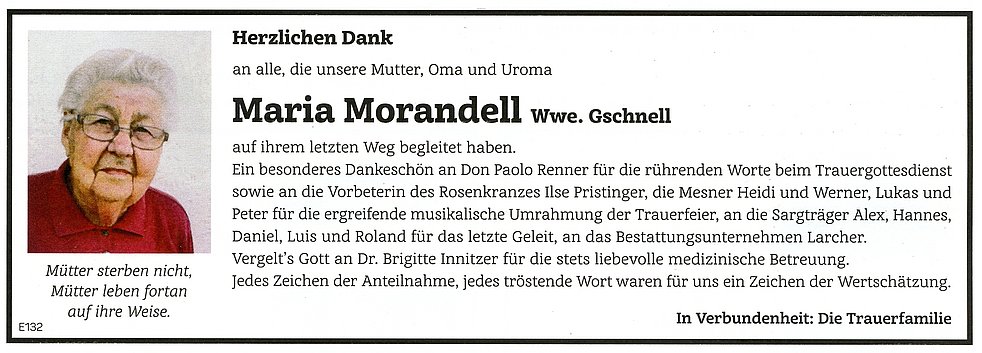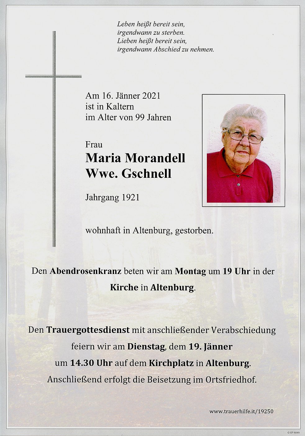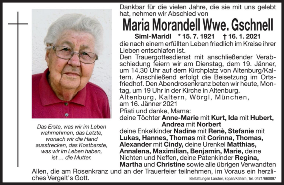 Den Trauergottesdienst mit anschließender Verabschiedung feiern wir am Dienstag, dem 19. Jänner um 14.30 Uhr auf dem Kirchplatz von Altenburg/Kaltern. Anschließend erfolgt die Beisetzung im Ortsfriedhof.