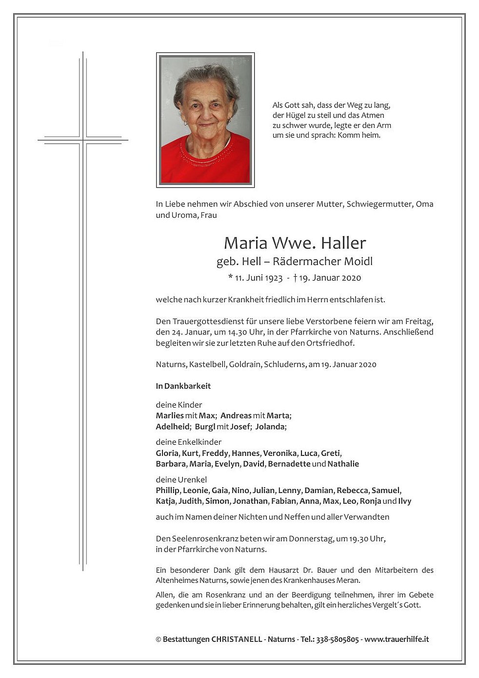 Den Trauergottesdienst für unsere liebe Verstorbene feiern wir am Freitag, den 24. Januar, um 14.30 Uhr, in der Pfarrkirche von Naturns. Anschließend begleiten wir sie zur letzten Ruhe auf den Ortsfriedhof.