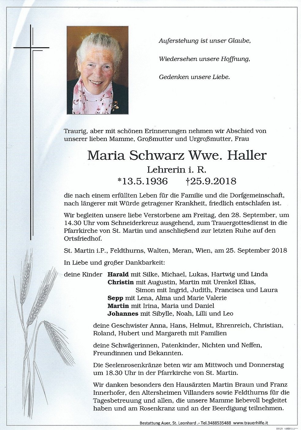 Wir danken besonders den Hausärzten Martin Braun und Franz Innerhofer, den Altersheimen Villanders sowie Feldthurns für die Tagesbetreuung und allen, die unsere Mamme liebevoll begleitet haben und am Rosenkranz und an der Beerdigung teilnehmen.