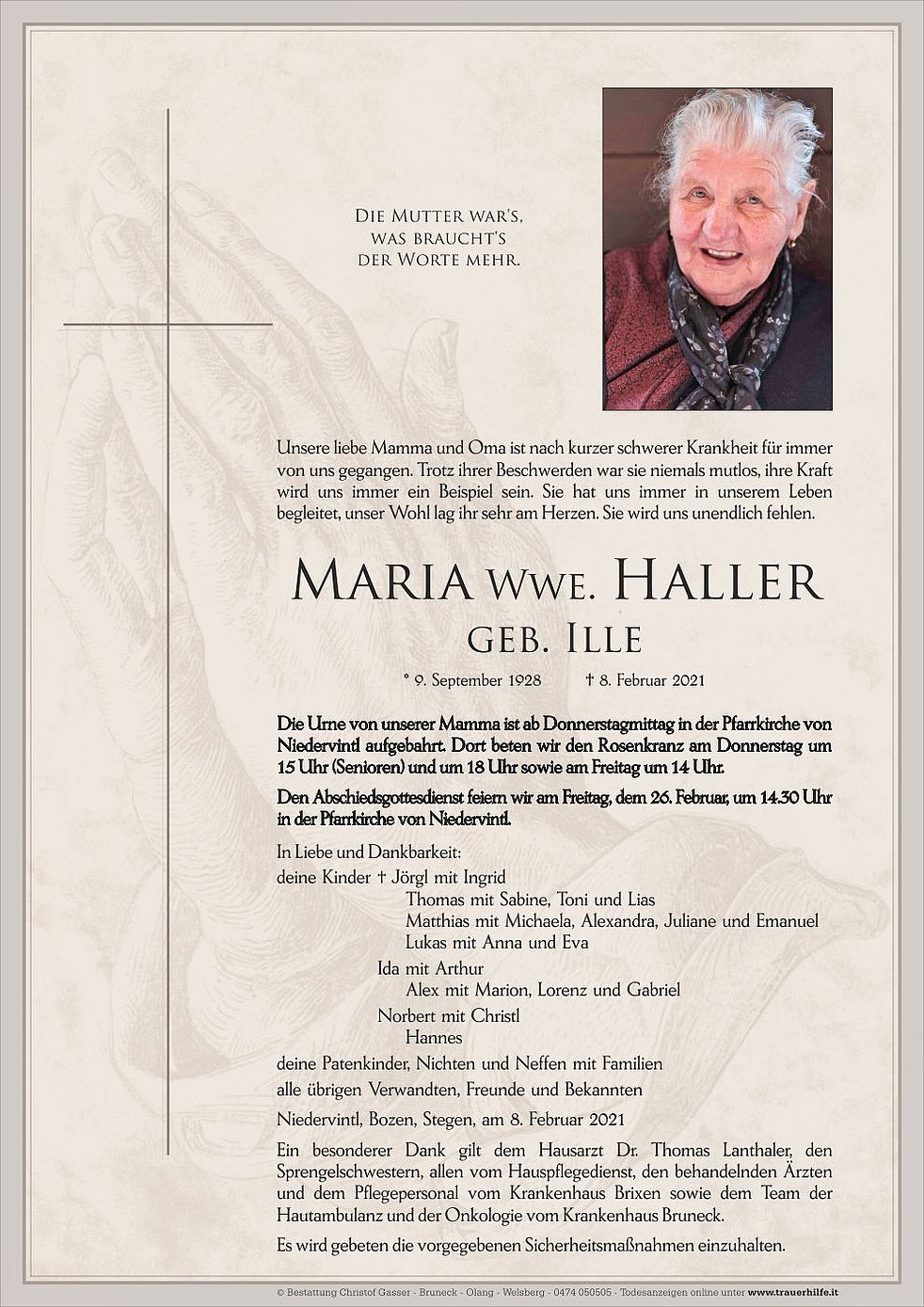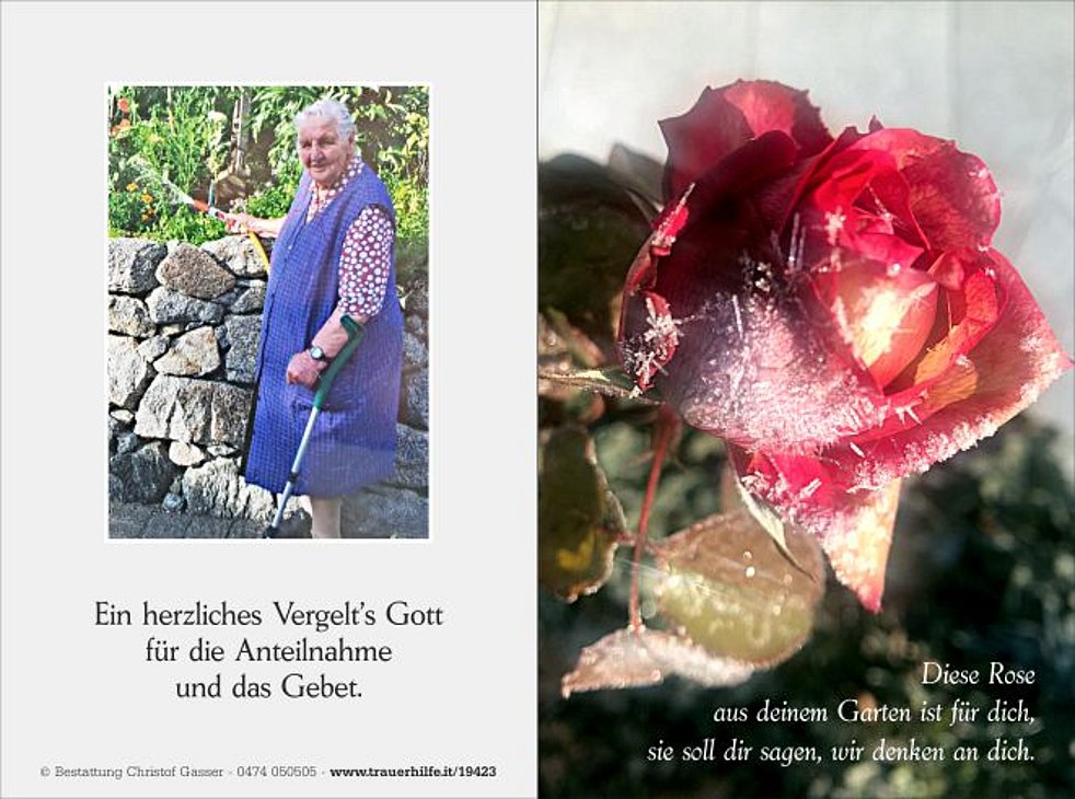 Die Urne von unserer Mamma ist ab Donnerstagmittag in der Pfarrkirche von Niedervintl aufgebahrt. Dort beten wir den Rosenkranz am Donnerstag um 15 Uhr (Senioren) und um 18 Uhr sowie am Freitag um 14 Uhr.