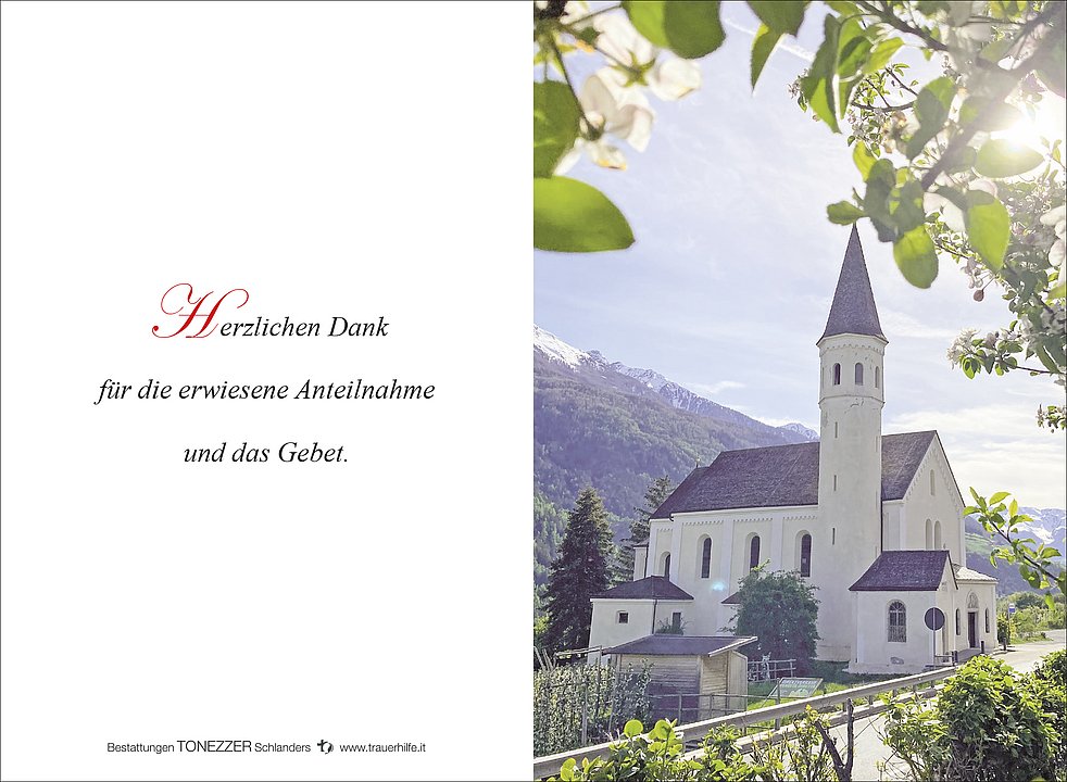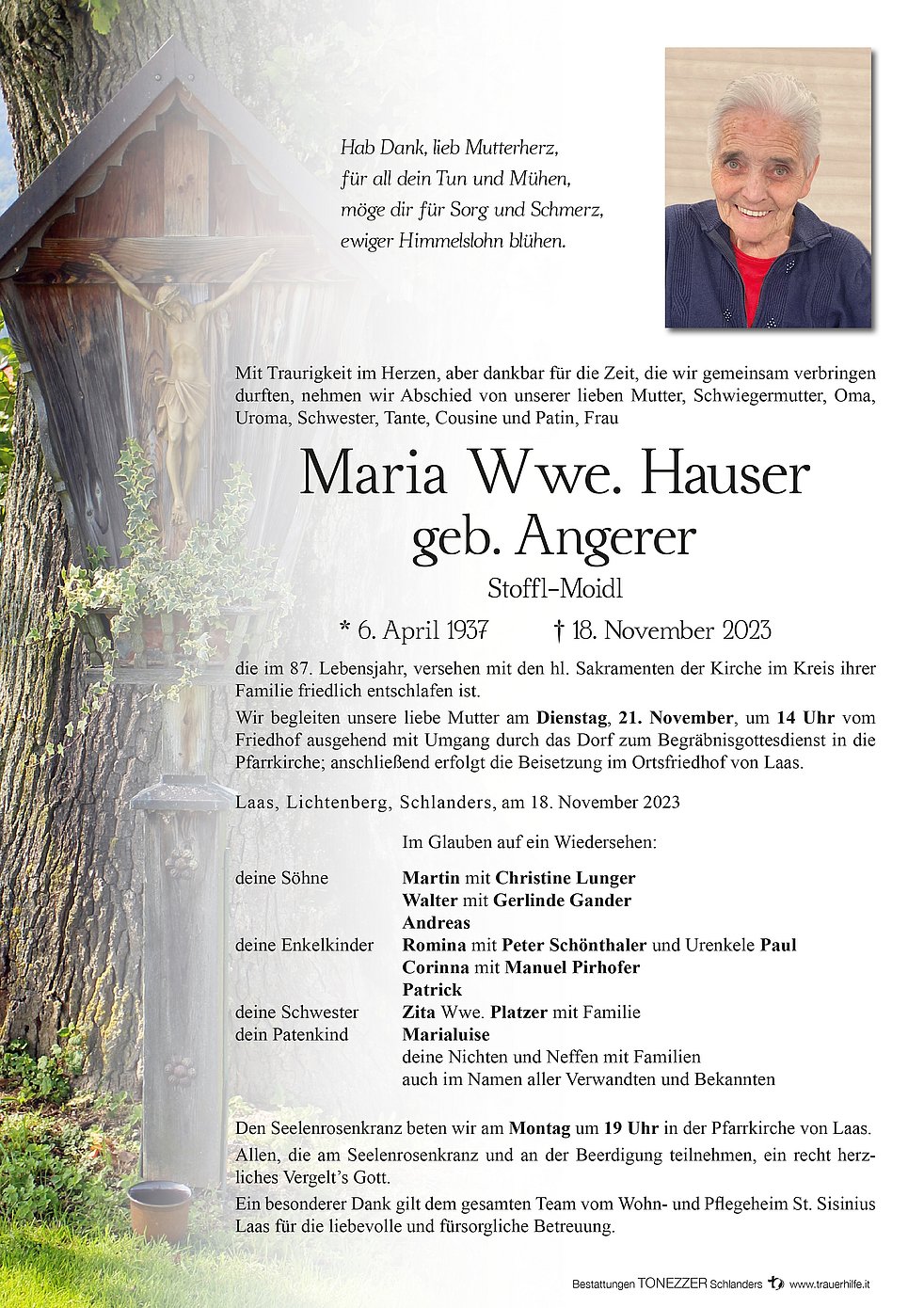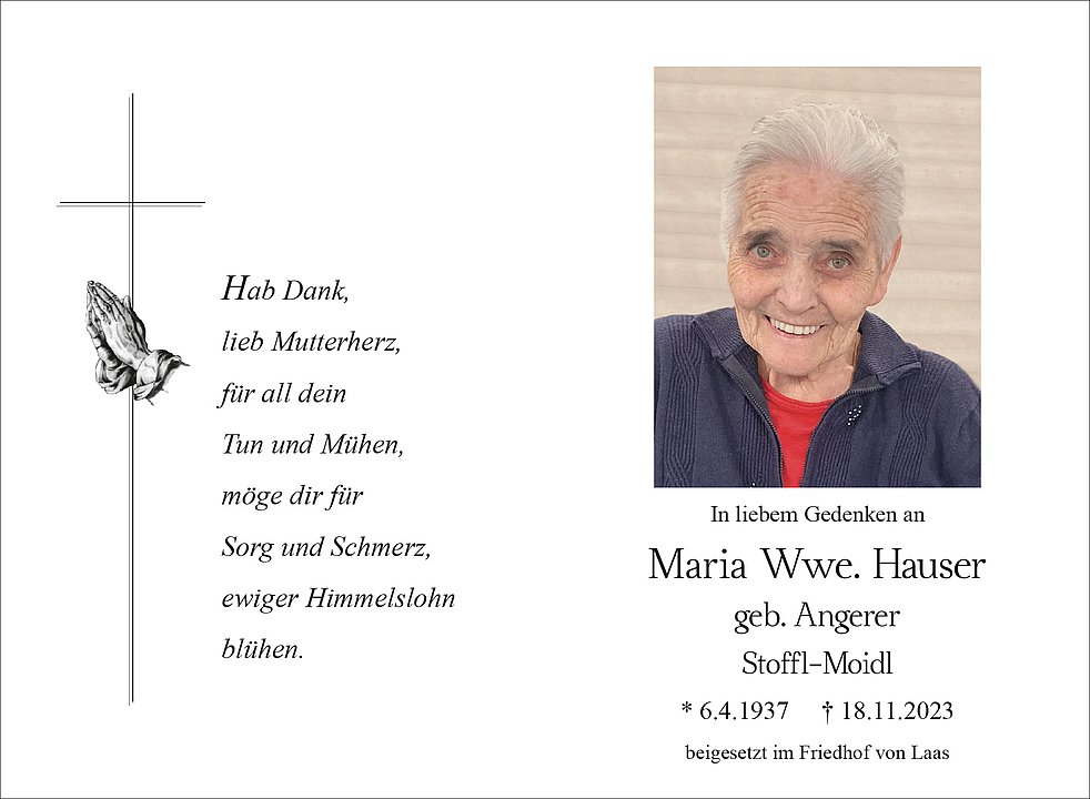 Wir begleiten unsere liebe Mutter am Dienstag, 21. November, um 14 Uhr vom Friedhof ausgehend mit Umgang durch das Dorf zum Begräbnisgottesdienst in die Pfarrkirche; anschließend erfolgt die Beisetzung im Ortsfriedhof von Laas.