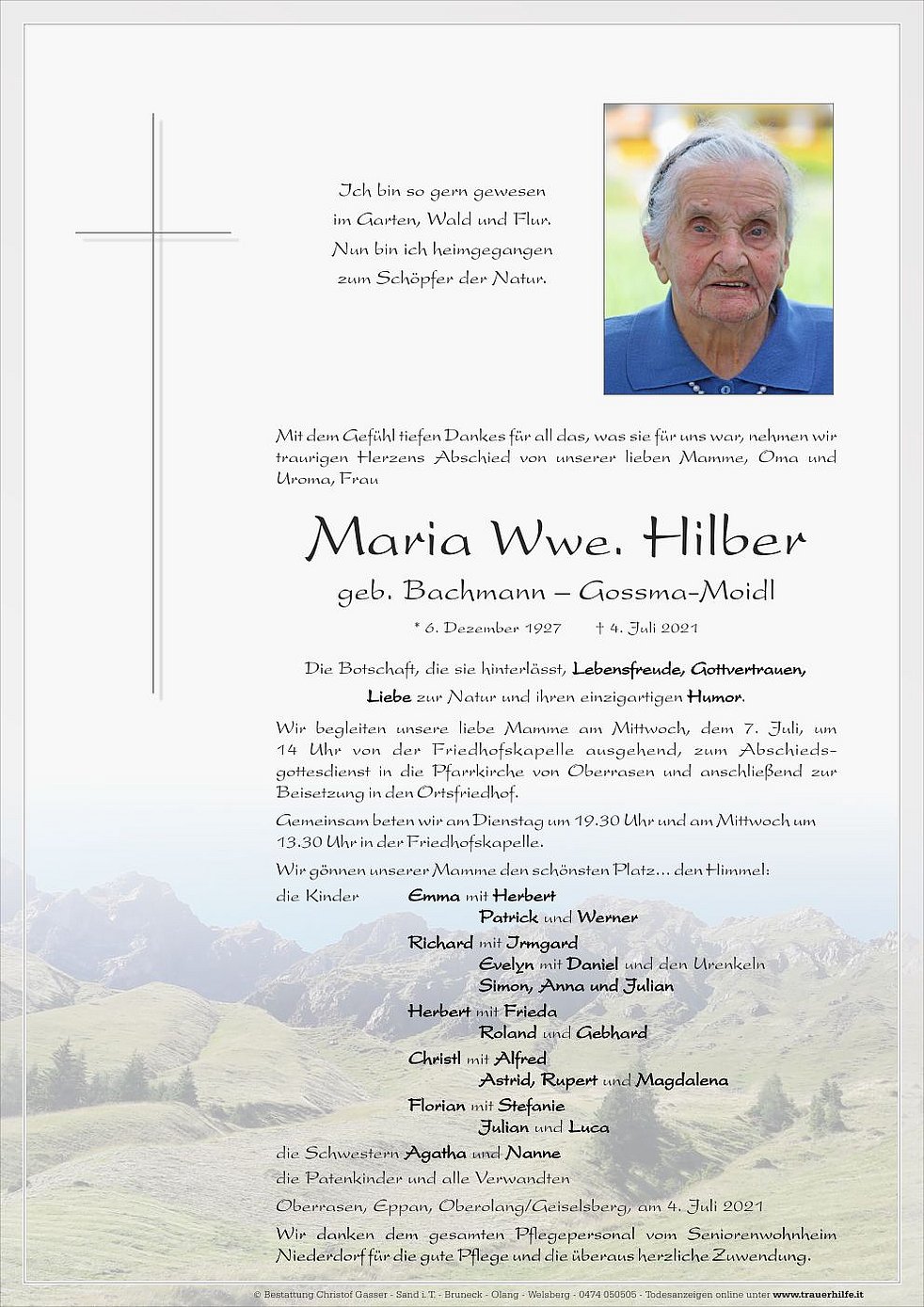 14 Uhr von der Friedhofskapelle ausgehend, zum Abschieds-gottesdienst in die Pfarrkirche von Oberrasen und anschließend zur Beisetzung in den Ortsfriedhof.