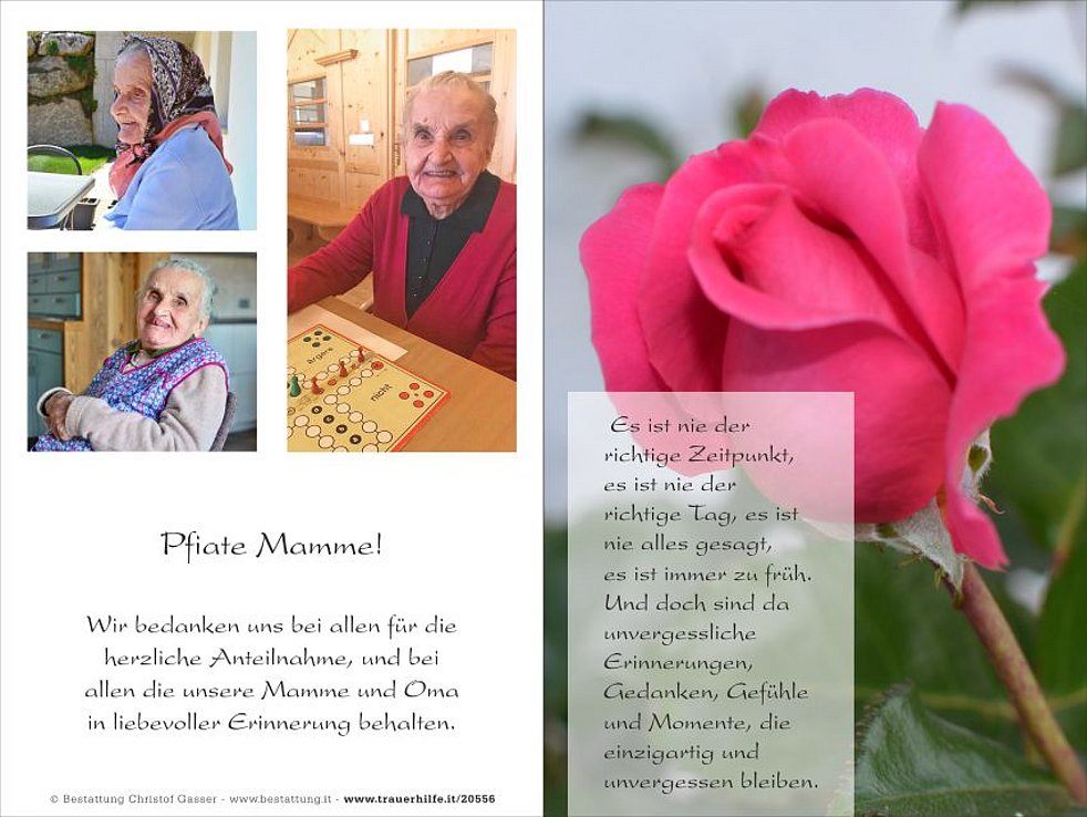 Wir danken dem gesamten Pflegepersonal vom Seniorenwohnheim Niederdorf für die gute Pflege und die überaus herzliche Zuwendung.