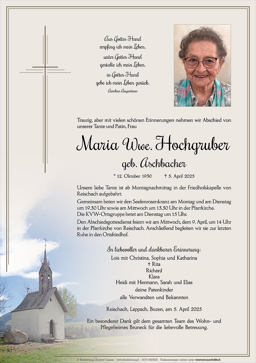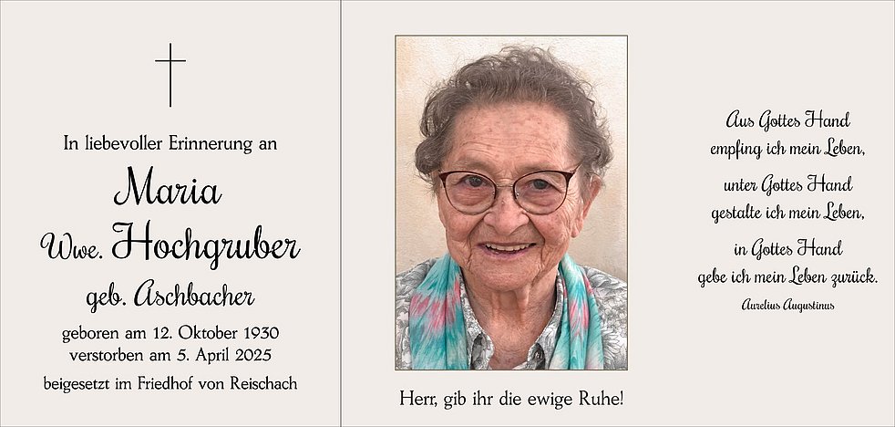 Den Abschiedsgottesdienst feiern wir am Mittwoch, dem 9. April, um 14 Uhr in der Pfarrkirche von Reischach. Anschließend begleiten wir sie zur letzten Ruhe in den Ortsfriedhof.