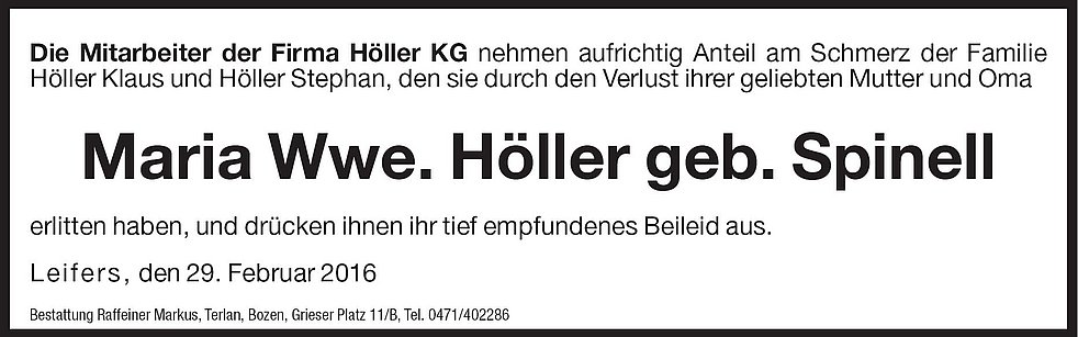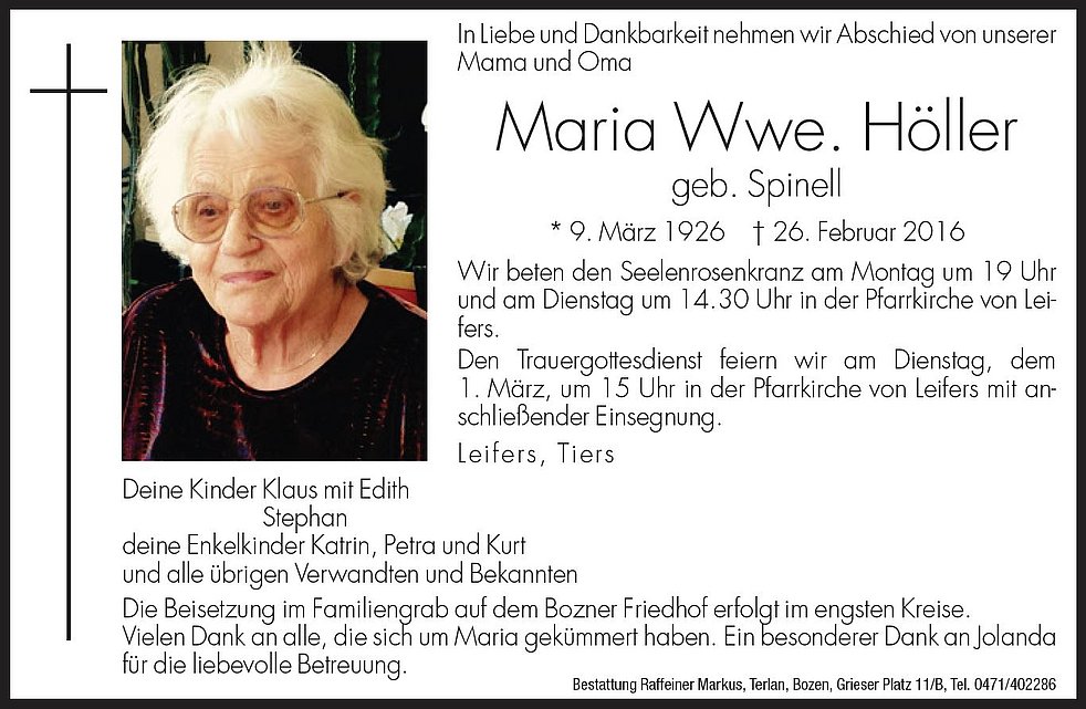 Den Trauergottesdienst feiern wir am Dienstag, den 1. März, um 15 Uhr in der Pfarrkirche von Leifers mit anschließender Einsegnung.