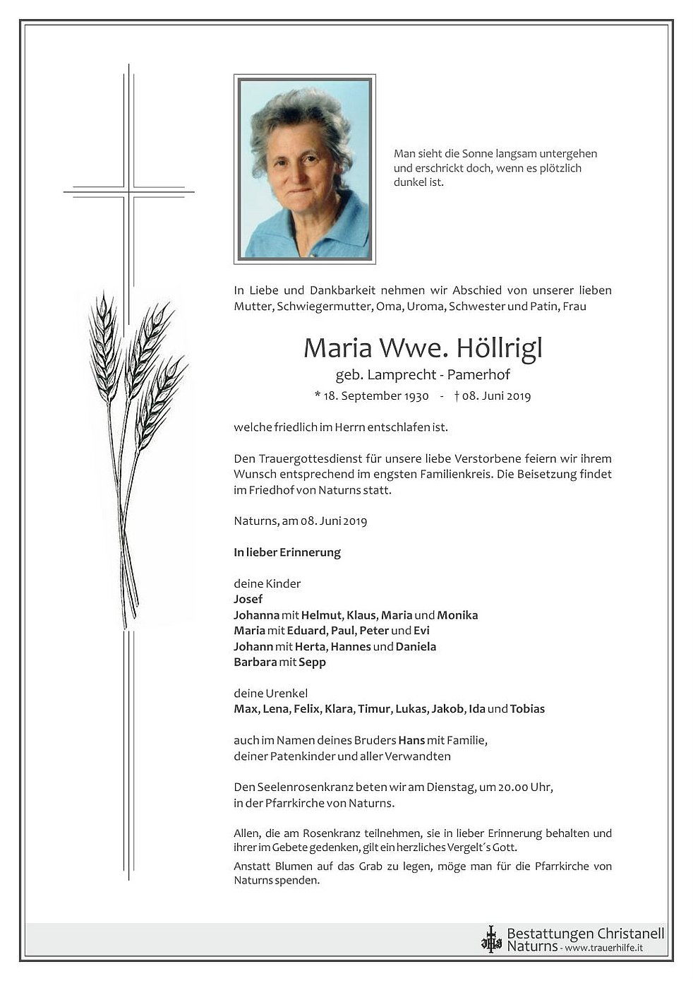 Den Trauergottesdienst für unsere liebe Verstorbene feiern wir ihrem Wunsch entsprechend im engsten Familienkreis. Die Beisetzung findet im Friedhof von Naturns statt.