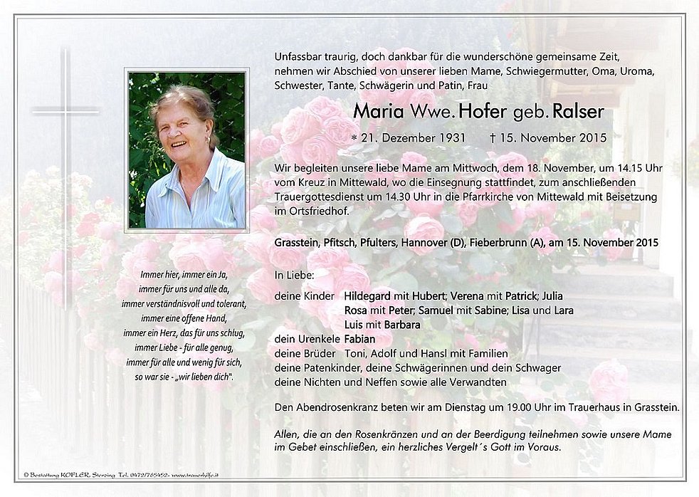 Maria Wwe. Hofer geb. Ralser