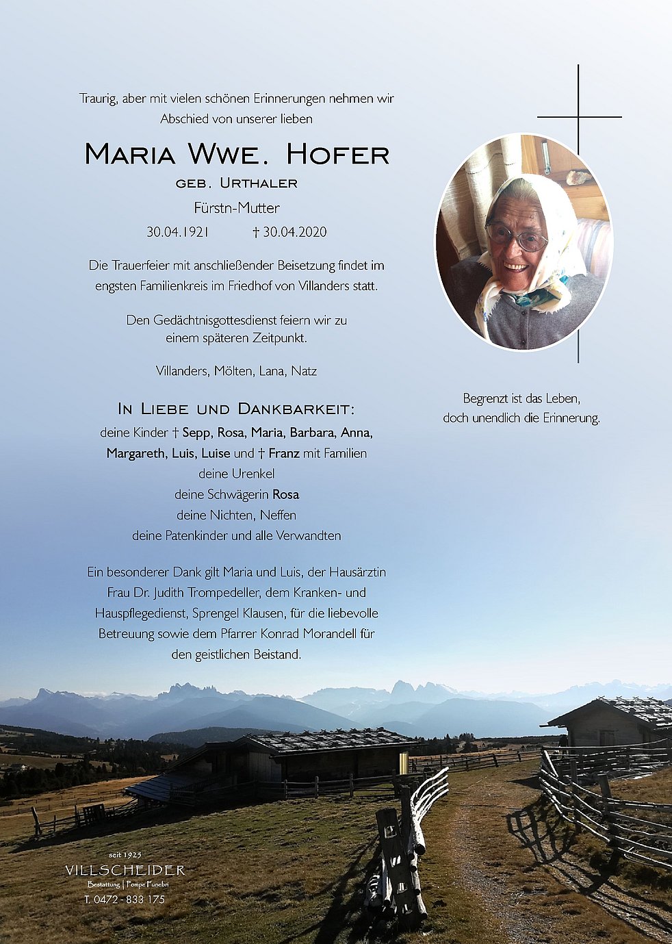 im Gedanken sind wir bei Euch und haben Eure Mama Oma und Uroma in ganz lieber Erinnerung vor allem mit der Villanderer Alm.
