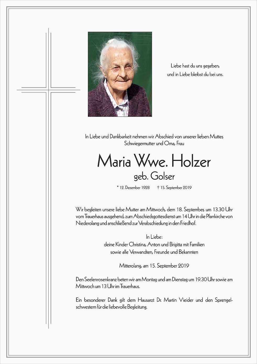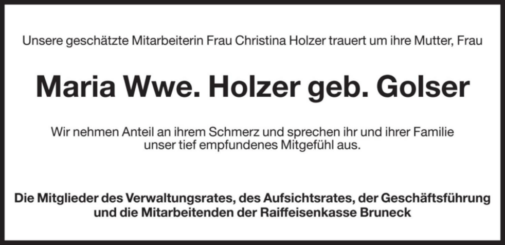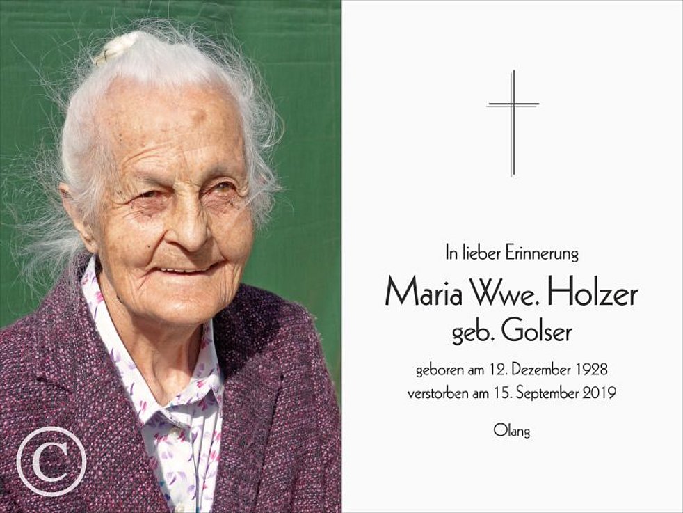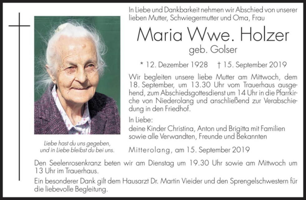 Wir begleiten unsere liebe Mutter am Mittwoch, dem 18. September, um 13.30 Uhr vom Trauerhaus ausgehend, zum Abschiedsgottesdienst um 14 Uhr in die Pfarrkirche von Niederolang und anschließend zur Verabschiedung in den Friedhof.