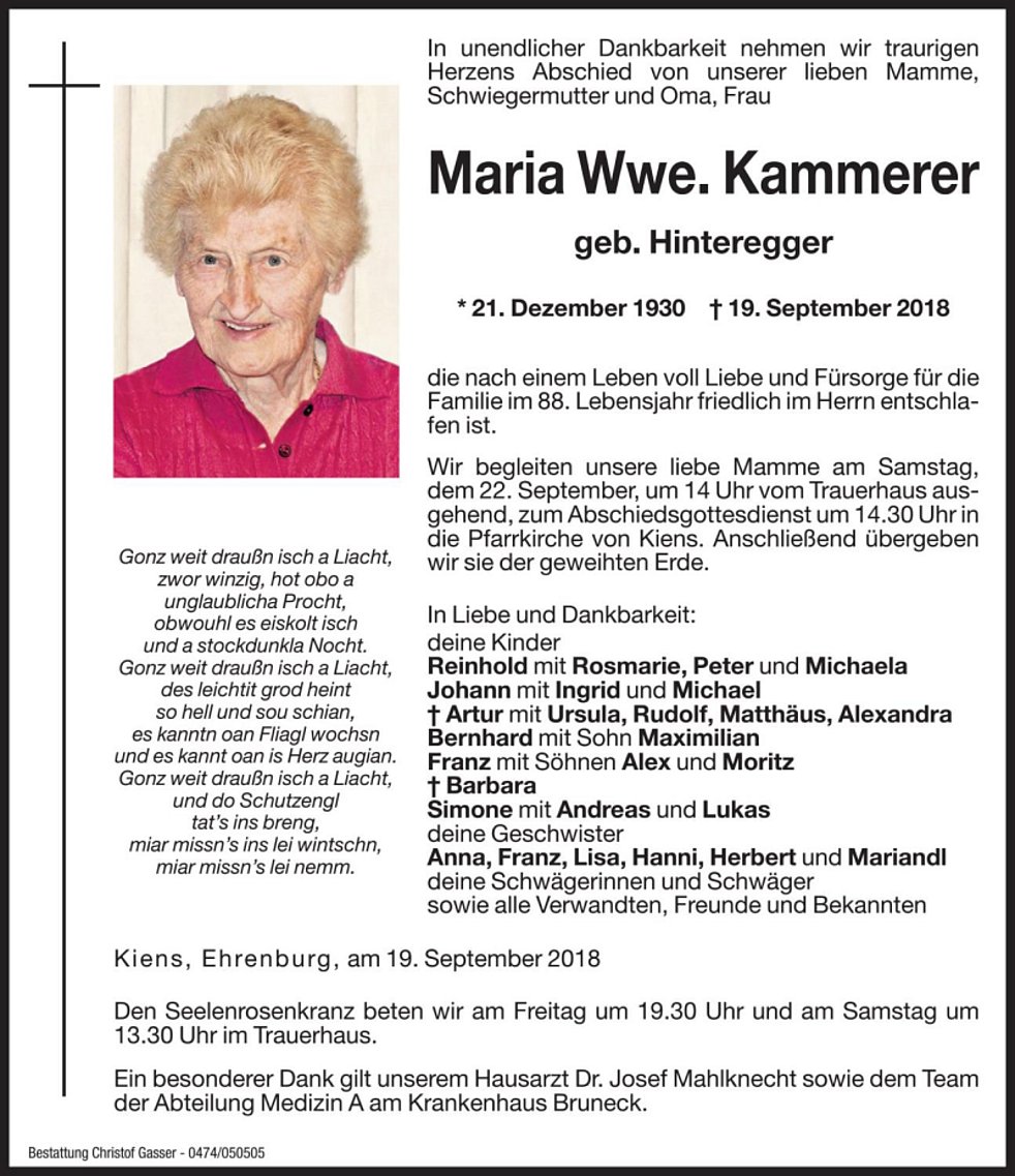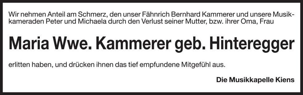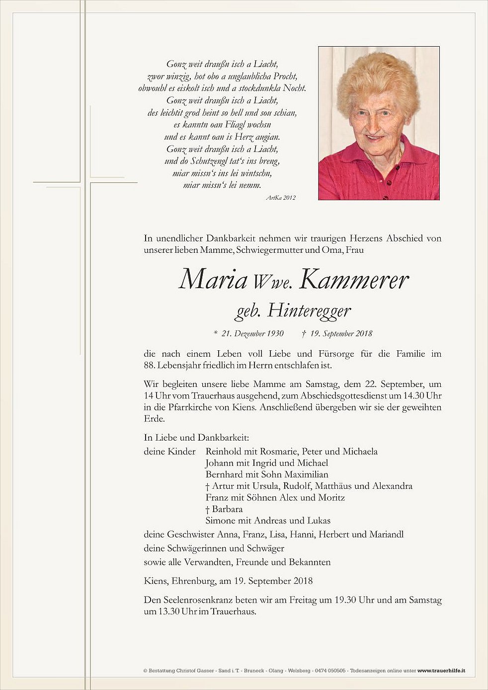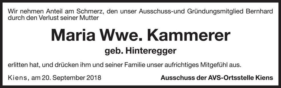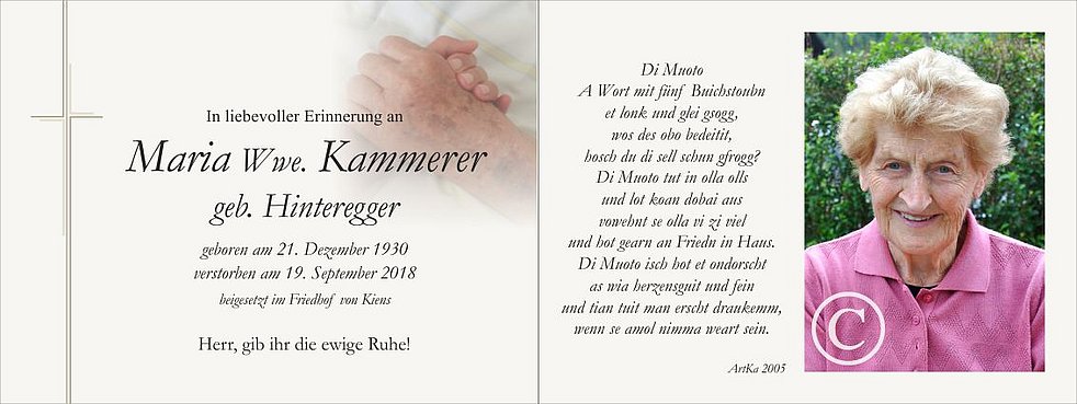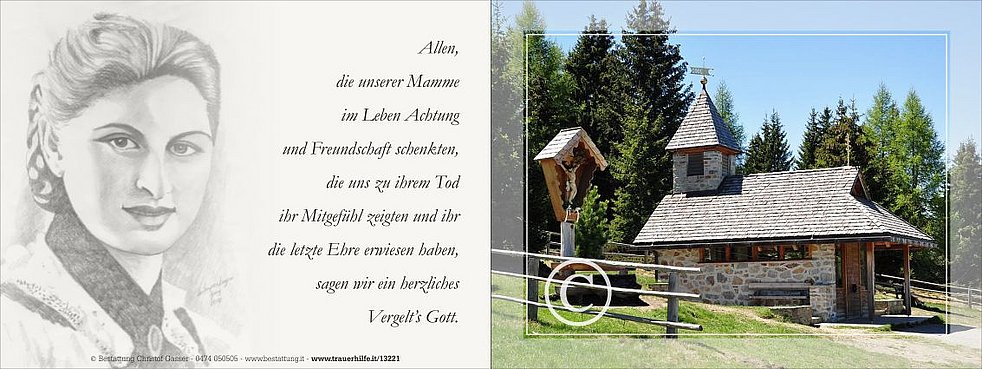 Wir begleiten unsere liebe Mamme am Samstag, dem 22. September, um 14 Uhr vom Trauerhaus ausgehend, zum Abschiedsgottesdienst um 14.30 Uhr in die Pfarrkirche von Kiens. Anschließend übergeben wir sie der geweihten Erde.