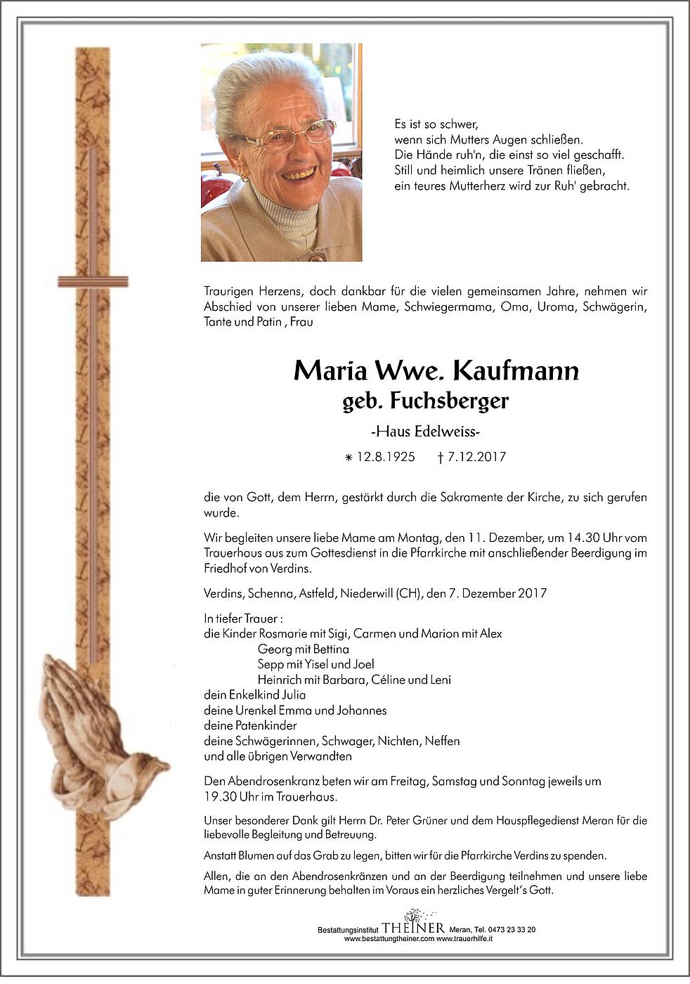 Wir begleiten unsere liebe Mame am Montag, den 11. Dezember, um 14.30 Uhr vom Trauerhaus aus zum Gottesdienst in die Pfarrkirche mit anschließender Beerdigung im Friedhof von Verdins.