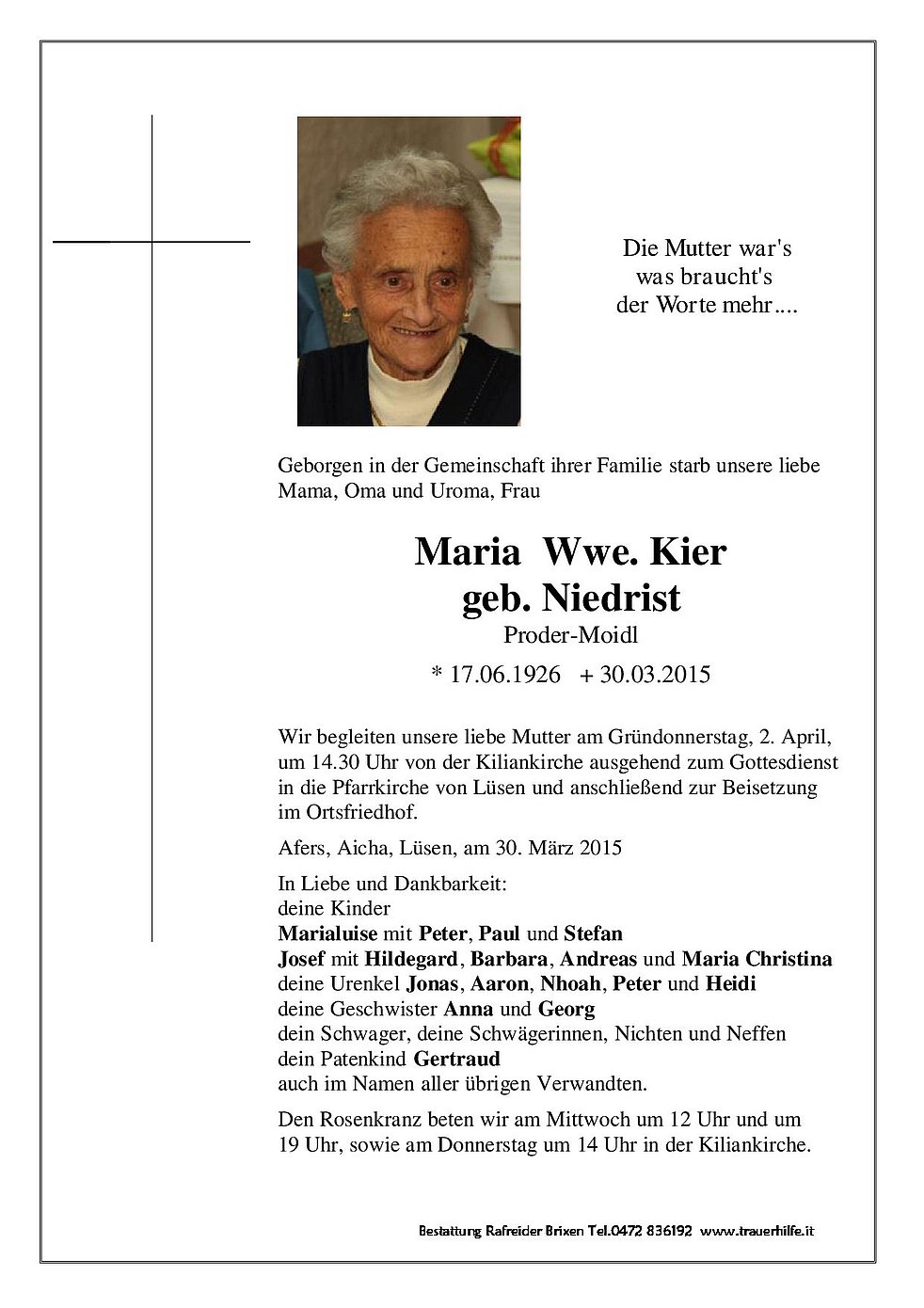 Wir begleiten unsere liebe Mutter am Gründonnerstag, 2. April, um 14.30 Uhr von der Kiliankirche ausgehend zum Gottesdienst in die Pfarrkirche von Lüsen und anschließend zur Beisetzung im Ortsfriedhof.