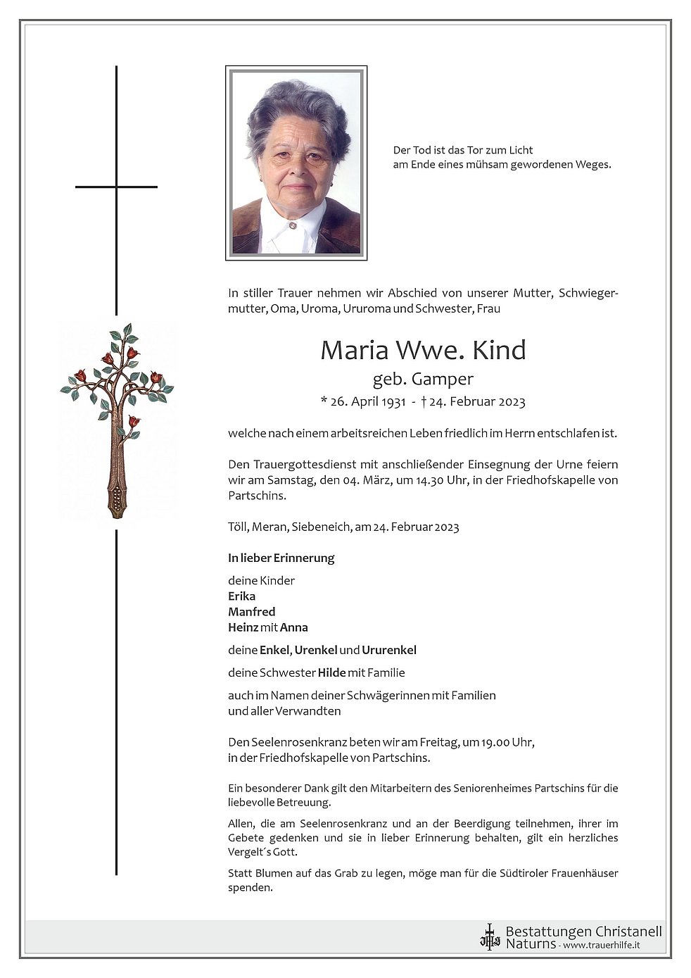Den Trauergottesdienst mit anschließender Einsegnung der Urne feiern wir am Samstag, den 04. März, um 14.30 Uhr, in der Friedhofskapelle von Partschins.