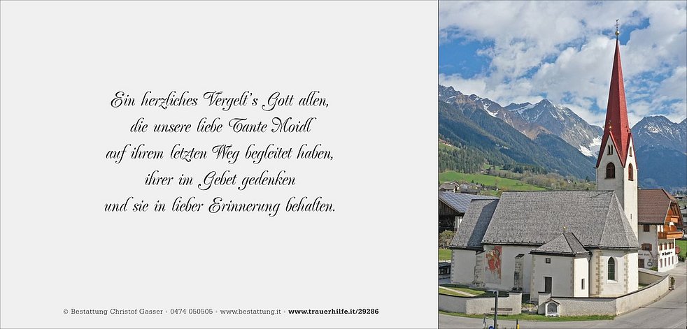 Unsere liebe Tante Moidl ist ab Mittwoch 17 Uhr in der Pfarrkirche von Antholz-Niedertal aufgebahrt.
