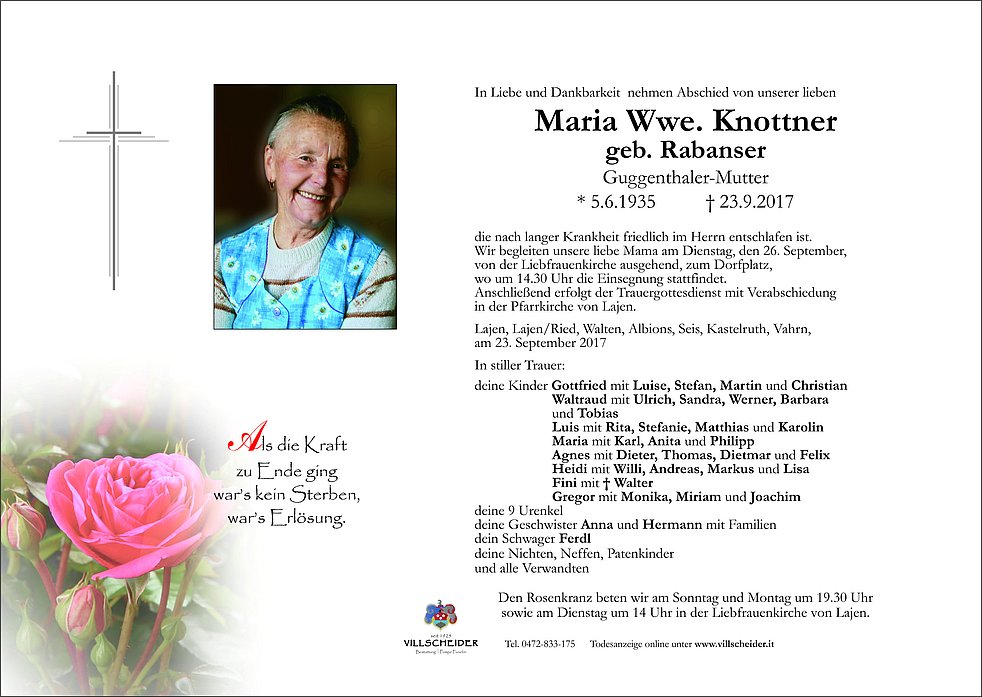 Trauerfeier: 26.09. - 14:30 Uhr Lajen