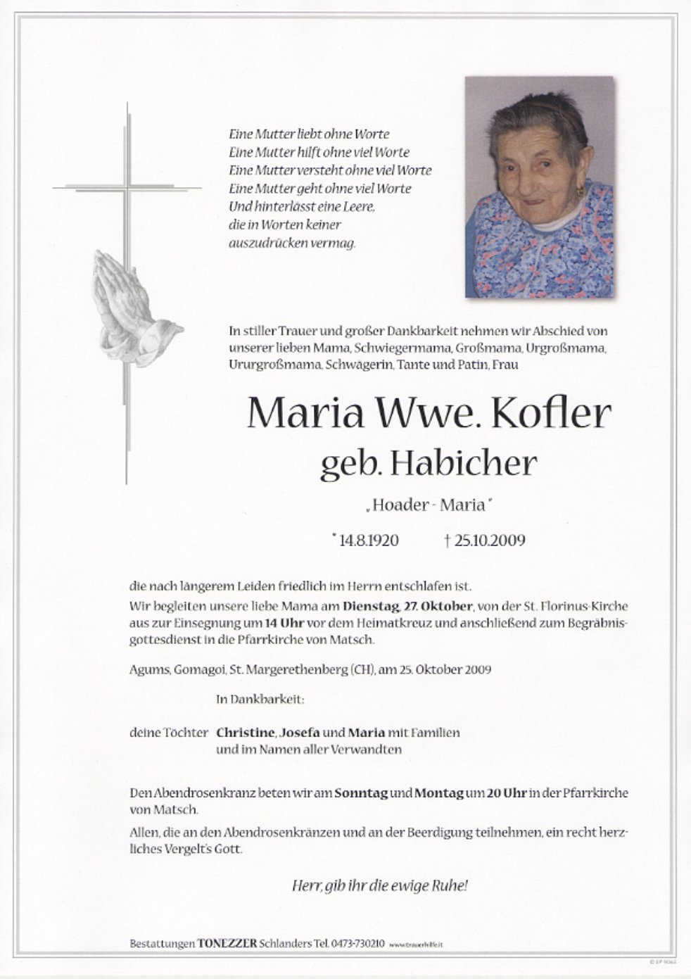 Wir begleiten unsere liebe Mama am Dienstag, 27. Oktober, von der St. Florinus-Kirche aus zur Einsegnung um 14 Uhr vor dem Heimatkreuz und anschließend zum Begräbnisgottesdienst in die Pfarrkirche von Matsch.