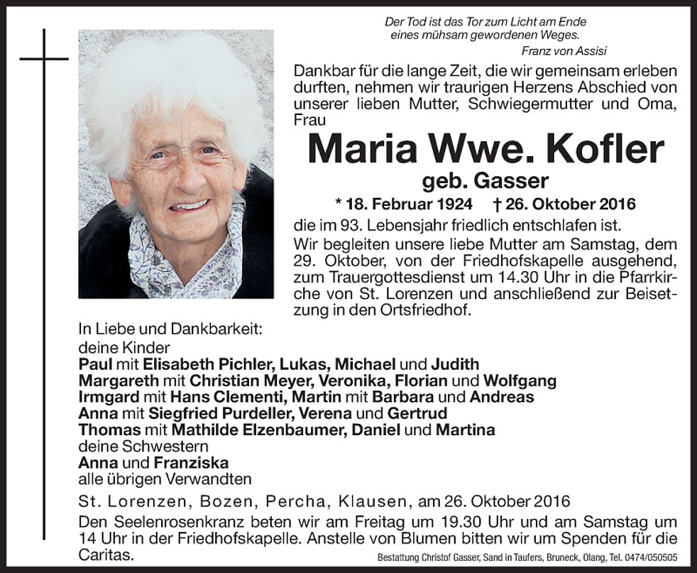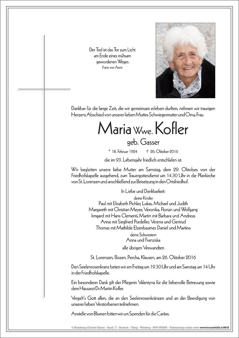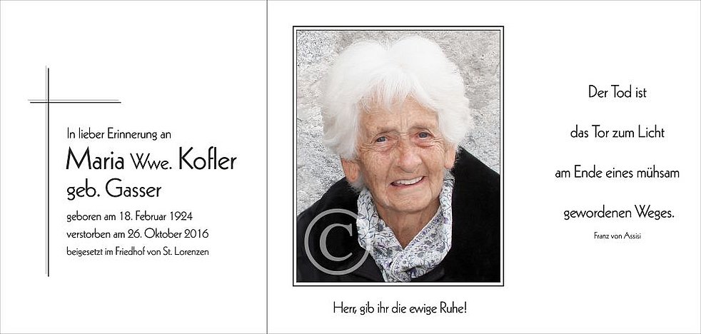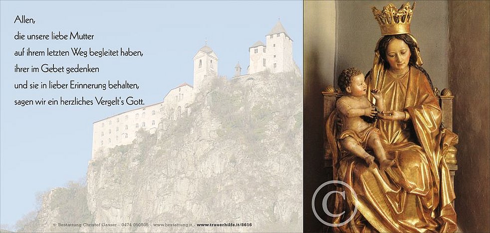 Wir begleiten unsere liebe Mutter am Samstag, dem 29. Oktober, von der Friedhofskapelle ausgehend, zum Trauergottesdienst um 14.30 Uhr in die Pfarrkirche von St. Lorenzen und anschließend zur Beisetzung in den Ortsfriedhof.