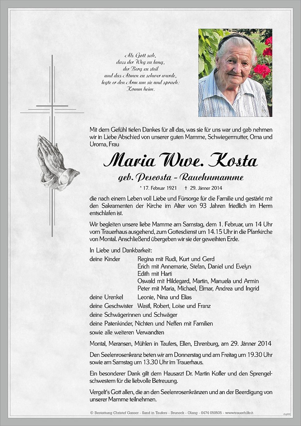 Wir begleiten unsere liebe Mamme am Samstag, dem 1. Februar, um 14 Uhr vom Trauerhaus ausgehend, zum Gottesdienst um 14.15 Uhr in die Pfarrkirche von Montal. Anschließend übergeben wir sie der geweihten Erde.