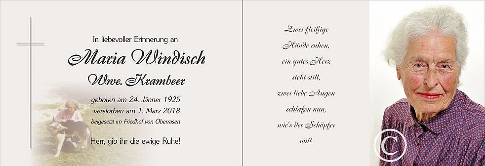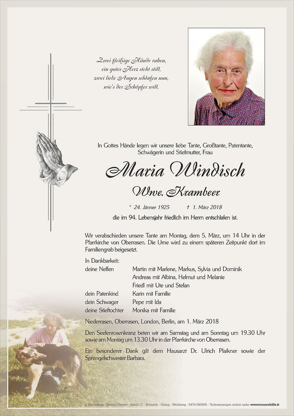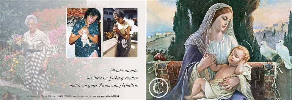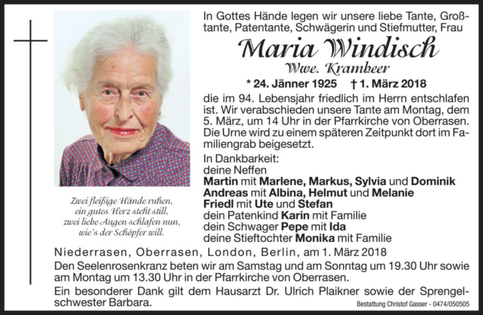 Wir verabschieden unsere Tante am Montag, dem 5. März, um 14 Uhr in der Pfarrkirche von Oberrasen. Die Urne wird zu einem späteren Zeitpunkt dort im Familiengrab beigesetzt.