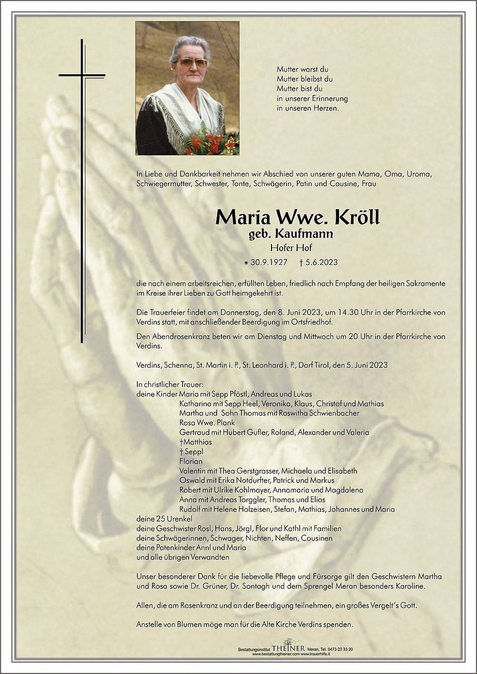 Die Trauerfeier findet am Donnerstag, den 8. Juni 2023, um 14.30 Uhr in der Pfarrkirche von Verdins statt, mit anschließender Beerdigung im Ortsfriedhof.